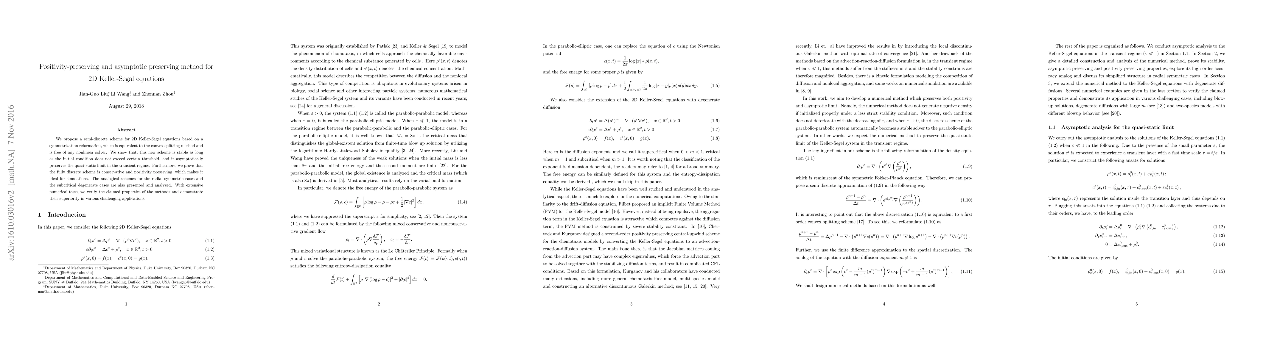 We propose a semi-discrete scheme for 2D Keller-Segel equations based on a symmetrization reformation, which is equivalent to the convex splitting method and is free of any nonlinear solver. We show that, this new scheme is unconditionally stable as long as the initial condition does not exceed certain threshold, and it asymptotically preserves the quasi-static limit in the transient regime. Furthermore, we prove that the fully discrete scheme is conservative and positivity preserving, which makes it ideal for simulations. The analogical schemes for the radial symmetric cases and the subcritical degenerate cases are also presented and analyzed. With extensive numerical tests, we verify the claimed properties of the methods and demonstrate their superiority in various challenging applications.