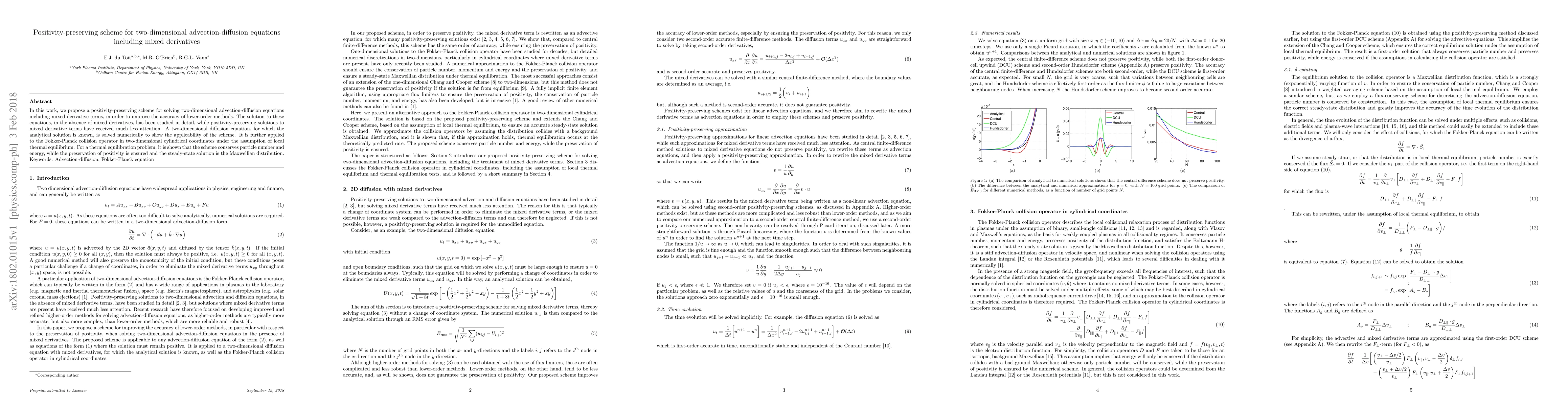 This paper proposes a positivity-preserving scheme to solve two-dimensional advection-diffusion equations with mixed derivatives, enhancing the accuracy of lower-order methods. The scheme is validated through numerical solutions of a known diffusion equation and applied to the Fokker-Planck collision operator, demonstrating conservation of particle number and energy, and preservation of positivity.