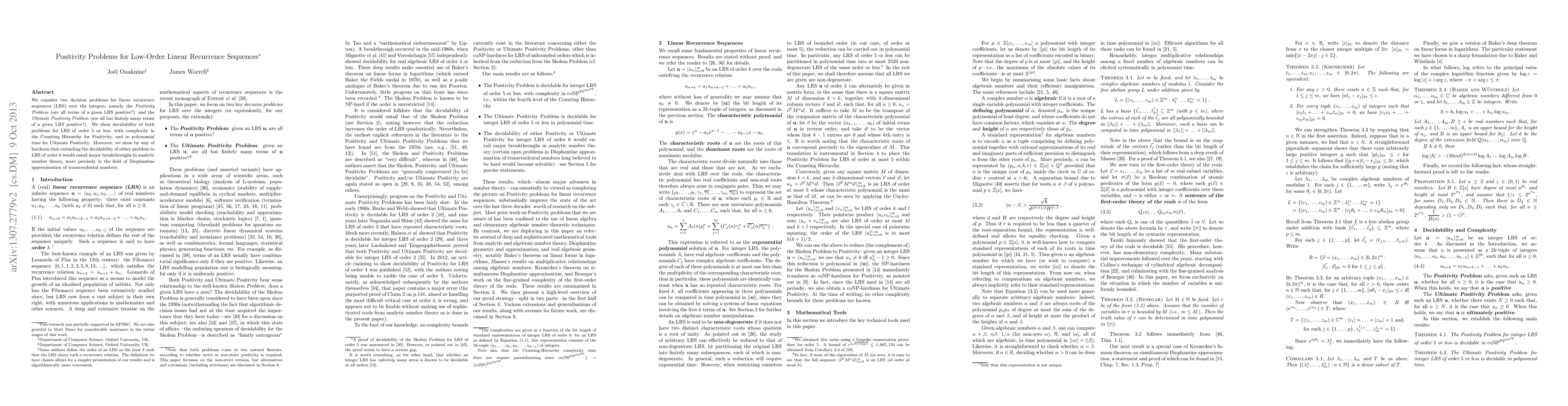This paper addresses the decidability of the Positivity and Ultimate Positivity Problems for linear recurrence sequences of order 5 or less, proving them to be solvable in the Counting Hierarchy and polynomial time respectively. It also highlights the computational difficulty of extending these results to sequences of order 6, suggesting it would require significant advances in Diophantine approximation.