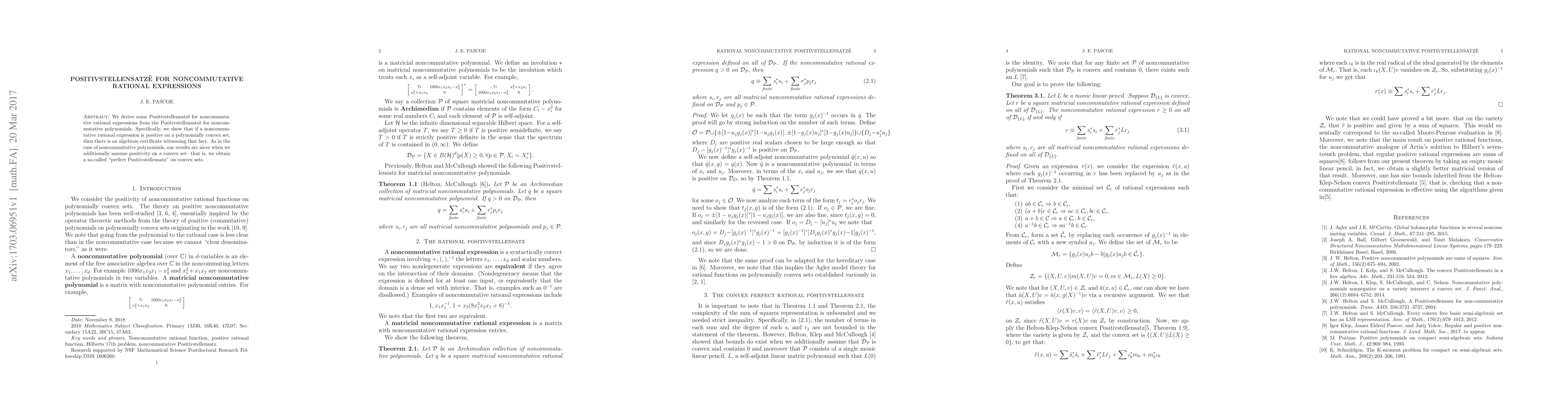We derive some Positivstellensatz\"e for noncommutative rational expressions from the Positivstellensatz\"e for noncommutative polynomials. Specifically, we show that if a noncommutative rational expression is positive on a polynomially convex set, then there is an algebraic certificate witnessing that fact. As in the case of noncommutative polynomials, our results are nicer when we additionally assume positivity on a convex set-- that is, we obtain a so-called "perfect Positivstellensatz" on convex sets.
