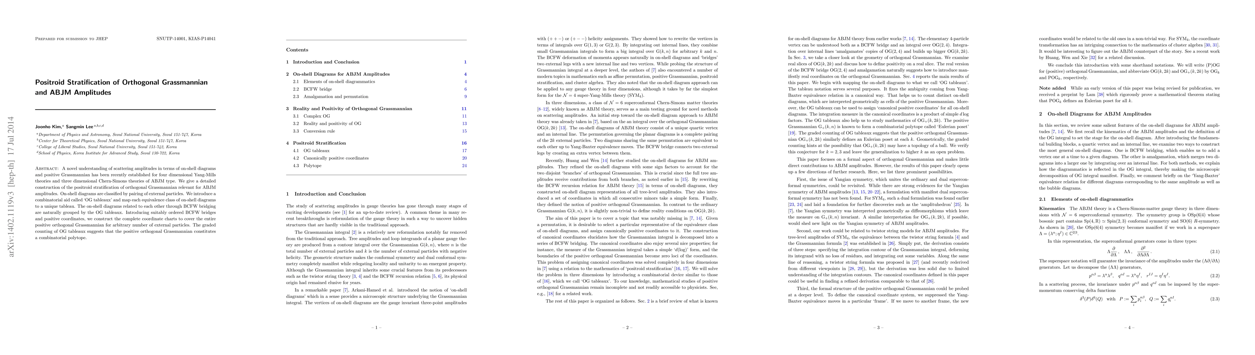 A novel understanding of scattering amplitudes in terms of on-shell diagrams and positive Grassmannian has been recently established for four dimensional Yang-Mills theories and three dimensional Chern-Simons theories of ABJM type. We give a detailed construction of the positroid stratification of orthogonal Grassmannian relevant for ABJM amplitudes. On-shell diagrams are classified by pairing of external particles. We introduce a combinatorial aid called `OG tableaux' and map each equivalence class of on-shell diagrams to a unique tableau. The on-shell diagrams related to each other through BCFW bridging are naturally grouped by the OG tableaux. Introducing suitably ordered BCFW bridges and positive coordinates, we construct the complete coordinate charts to cover the entire positive orthogonal Grassmannian for arbitrary number of external particles. The graded counting of OG tableaux suggests that the positive orthogonal Grassmannian constitutes a combinatorial polytope.