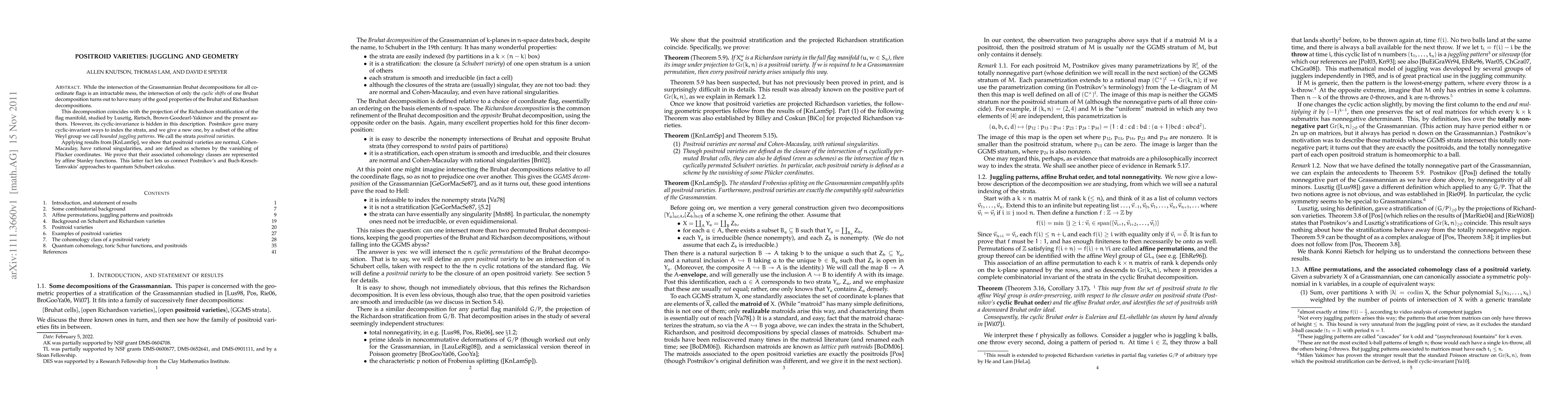 While the intersection of the Grassmannian Bruhat decompositions for all coordinate flags is an intractable mess, the intersection of only the cyclic shifts of one Bruhat decomposition turns out to have many of the good properties of the Bruhat and Richardson decompositions. This decomposition coincides with the projection of the Richardson stratification of the flag manifold, studied by Lusztig, Rietsch, Brown-Goodearl-Yakimov and the present authors. However, its cyclic-invariance is hidden in this description. Postnikov gave many cyclic-invariant ways to index the strata, and we give a new one, by a subset of the affine Weyl group we call bounded juggling patterns. We call the strata positroid varieties. Applying results from the authors' previous work, we show that positroid varieties are normal, Cohen-Macaulay, have rational singularities, and are defined as schemes by the vanishing of Plucker coordinates. We prove that their associated cohomology classes are represented by affine Stanley functions. This last fact lets us connect Postnikov's and Buch-Kresch-Tamvakis' approaches to quantum Schubert calculus.