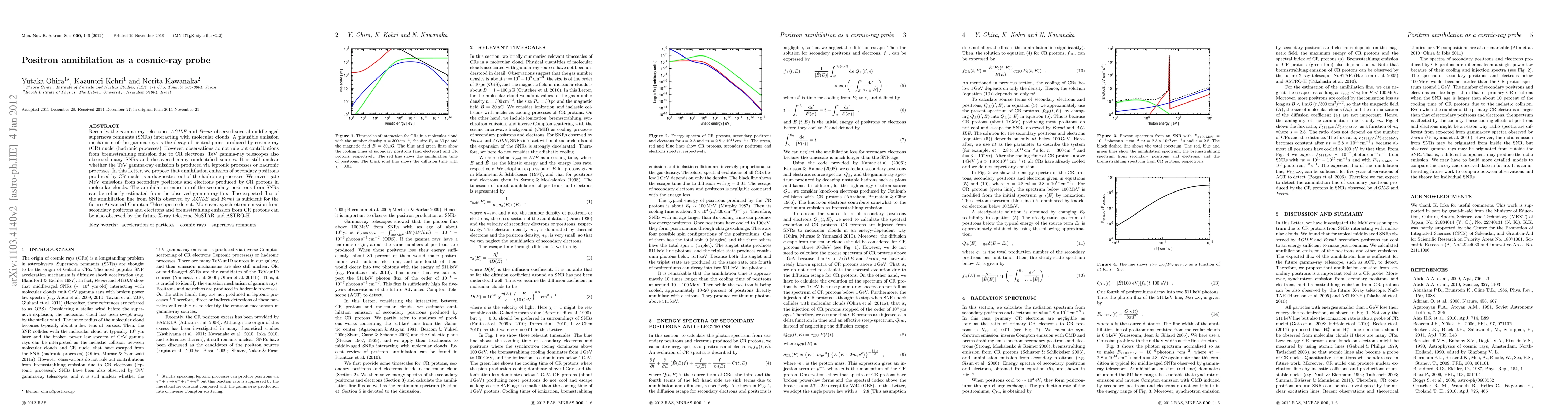 Recently, the gamma-ray telescopes AGILE and Fermi observed several middle-aged supernova remnants (SNRs) interacting with molecular clouds. A plausible emission mechanism of the gamma rays is the decay of neutral pions produced by cosmic ray (CR) nuclei (hadronic processes). However, observations do not rule out contributions from bremsstrahlung emission due to CR electrons. TeV gamma-ray telescopes also observed many SNRs and discovered many unidentified sources. It is still unclear whether the TeV gamma-ray emission is produced via leptonic processes or hadronic processes. In this Letter, we propose that annihilation emission of secondary positrons produced by CR nuclei is a diagnostic tool of the hadronic processes. We investigate MeV emissions from secondary positrons and electrons produced by CR protons in molecular clouds. The annihilation emission of the secondary positrons from SNRs can be robustly estimated from the observed gamma-ray flux. The expected flux of the annihilation line from SNRs observed by AGILE and Fermi is sufficient for the future Advanced Compton Telescope to detect. Moreover, synchrotron emission from secondary positrons and electrons and bremsstrahlung emission from CR protons can be also observed by the future X-ray telescope NuSTAR and ASTRO-H.