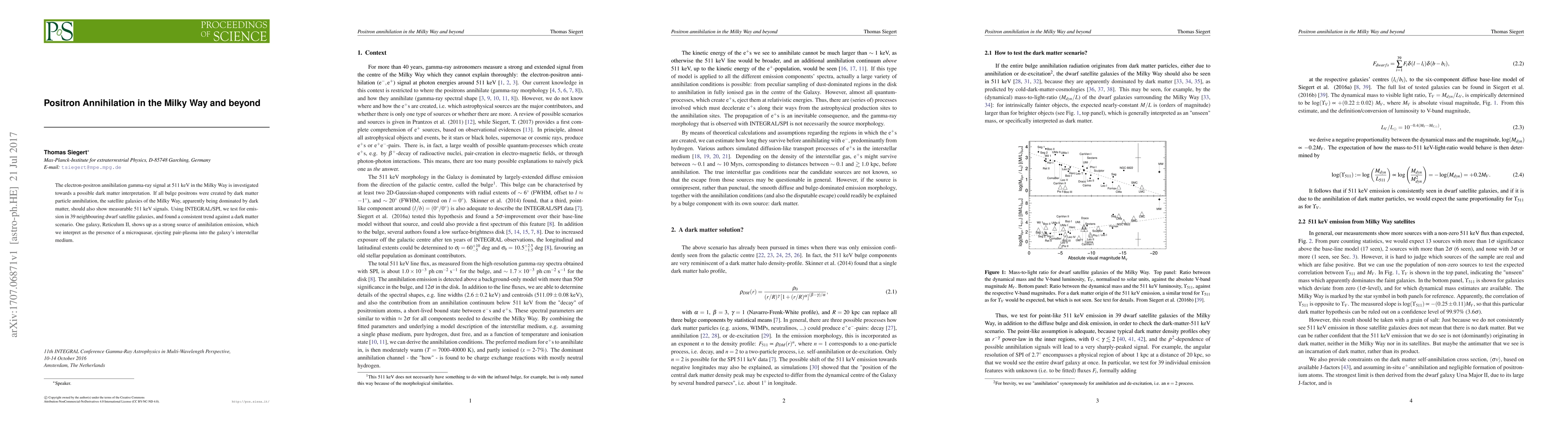 The electron-positron annihilation gamma-ray signal at 511 keV in the Milky Way is investigated towards a possible dark matter interpretation. If all bulge positrons were created by dark matter particle annihilation, the satellite galaxies of the Milky Way, apparently being dominated by dark matter, should also show measurable 511 keV signals. Using INTEGRAL/SPI, we test for emission in 39 neighbouring dwarf satellite galaxies, and found a consistent trend against a dark matter scenario. One galaxy, Reticulum II, shows up as a strong source of annihilation emission, which we interpret as the presence of a microquasar, ejecting pair-plasma into the galaxy's interstellar medium.