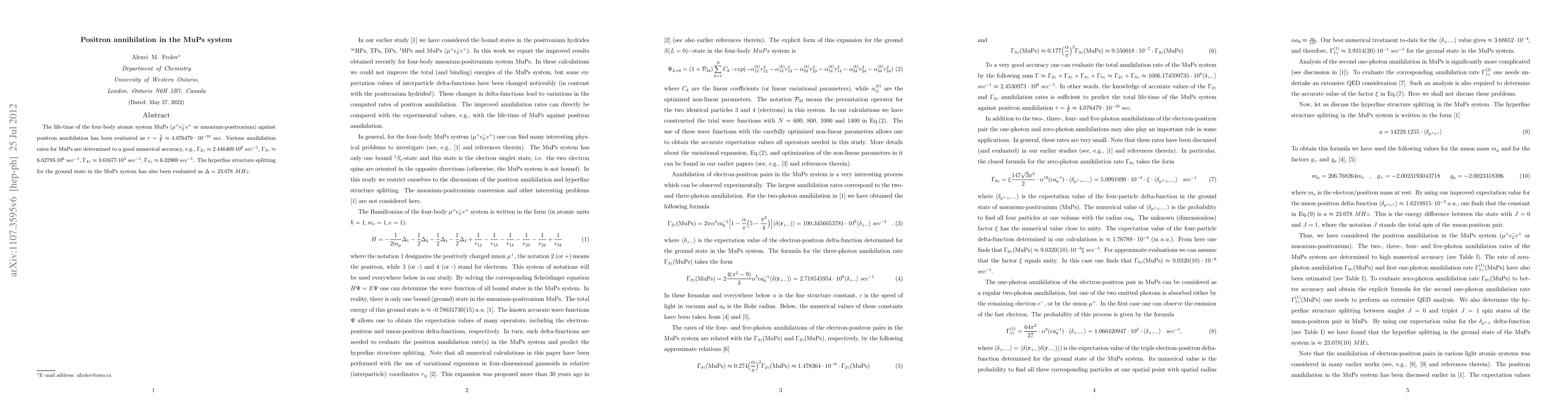 Researchers measured the life-time of MuPs, a four-body atomic system, to 4.076453e-10 seconds, and determined various annihilation rates with high accuracy. The study also evaluated hyperfine structure splitting for the ground state in MuPs.