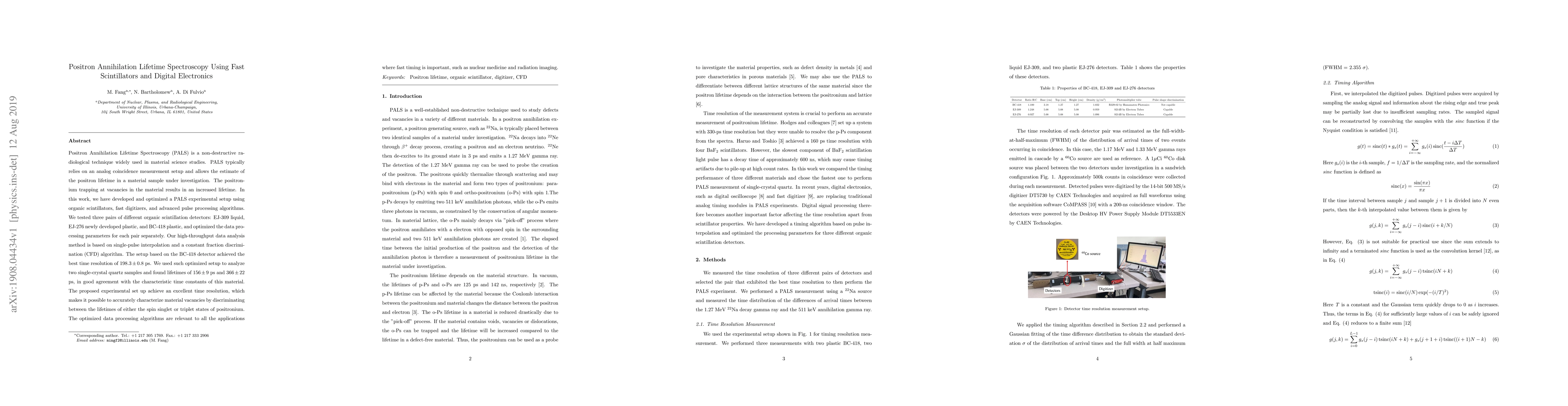 This paper presents an optimized Positron Annihilation Lifetime Spectroscopy (PALS) setup using fast organic scintillators and digital electronics, achieving a time resolution of 198.3 ± 0.8 ps with BC-418 plastic scintillators. The setup successfully characterized vacancies in single-crystal quartz samples, demonstrating its potential for applications requiring precise timing, such as nuclear medicine and radiation imaging.