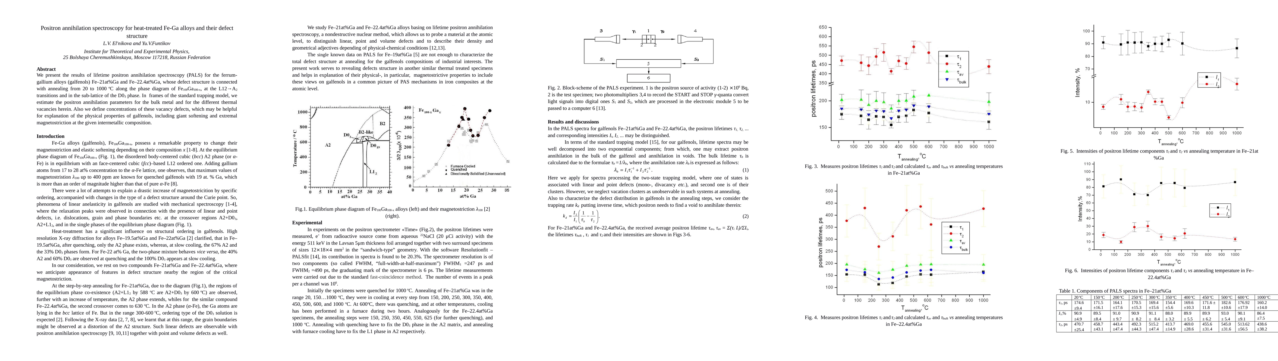 This study uses lifetime positron annihilation spectroscopy (PALS) to analyze the defect structure of heat-treated Fe-Ga alloys (Fe21Ga and Fe22.4Ga) during annealing from 20 to 1000°C, focusing on L12-A2 transitions and the D03 phase sub-lattice. The research estimates positron annihilation parameters and vacancy defect concentrations, which may elucidate the physical properties of these alloys.