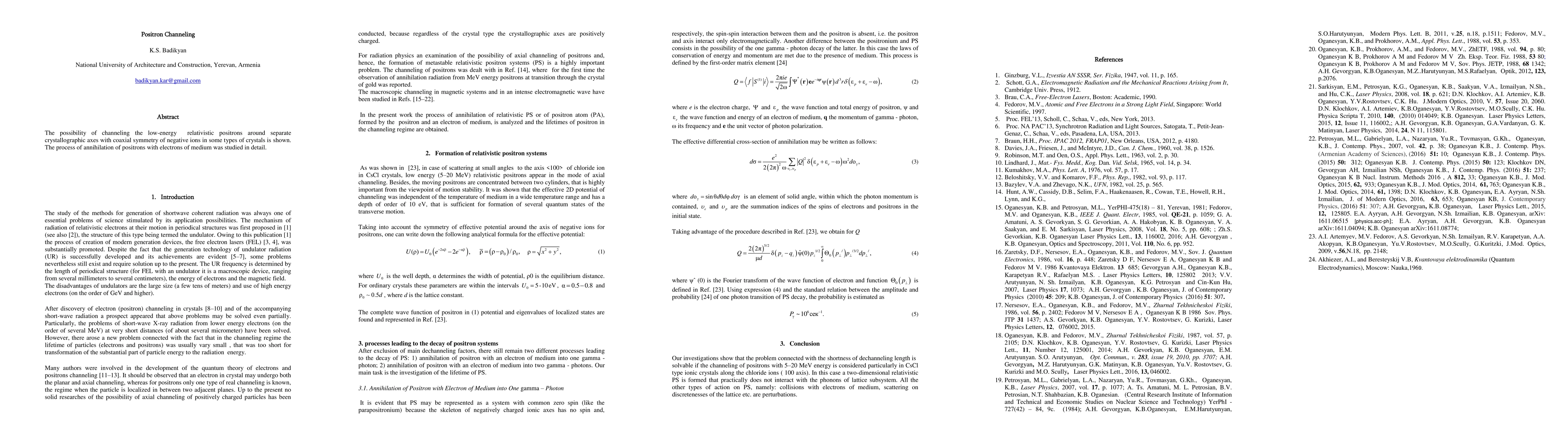 The possibility of channeling the low-energy relativistic positrons around separate crystallographic axes with coaxial symmetry of negative ions in some types of crystals is shown. The process of annihilation of positrons with electrons of medium was studied in detail.