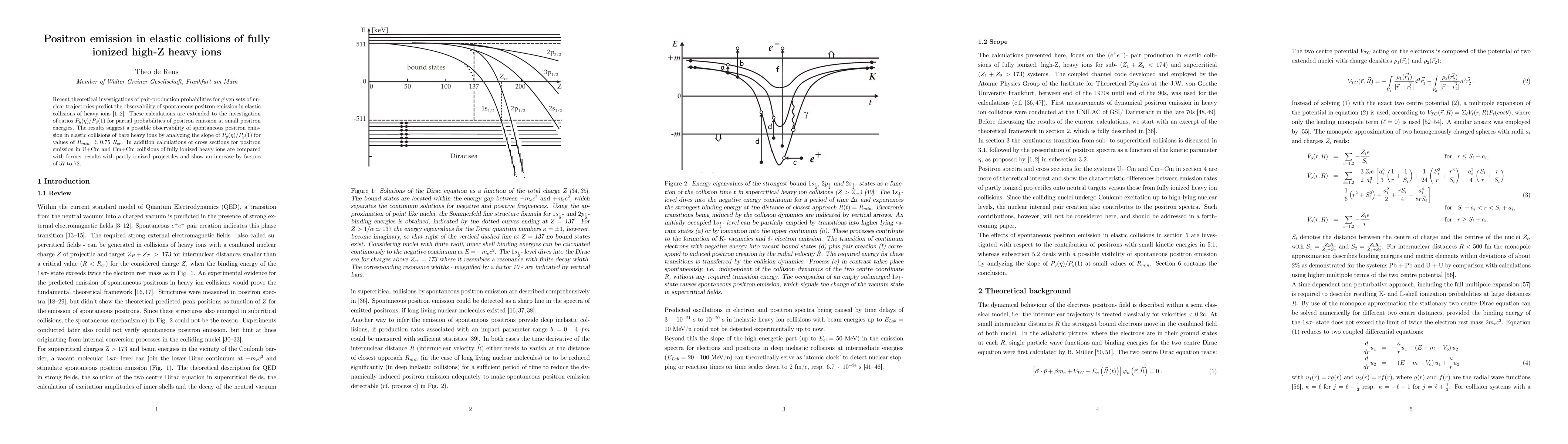 Recent theoretical investigations of pair-production probabilities for given sets of nuclear trajectories predict the observability of spontaneous positron emission in elastic collisions of heavy ions. These calculations are extended to the investigation of ratios $P_{y}(\eta)/P_{y}(1)$ for partial probabilities of positron emission at small positron energies. The results suggest a possible observability of spontaneous positron emission in elastic collisions of bare heavy ions by analyzing the slope of $P_{y}(\eta)/P_{y}(1)$ for values of $R_{min}$ $~_{\sim}\!\!\!\!^<$ 0.75 $R_{cr}$. In addition calculations of cross sections for positron emission in U+Cm and Cm+Cm collisions of fully ionized heavy ions are compared with former results with partly ionized projectiles and show an increase by factors of 57 to 72.