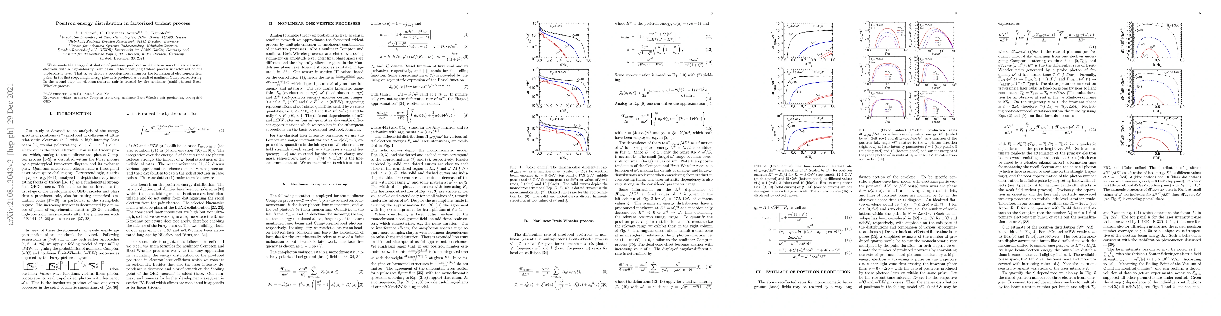 This paper estimates the energy distribution of positrons generated in the factorized trident process, where ultra-relativistic electrons interact with high-intensity laser beams. The process involves nonlinear Compton scattering to produce high-energy photons followed by the multi-photon Breit-Wheeler process to create electron-positron pairs.