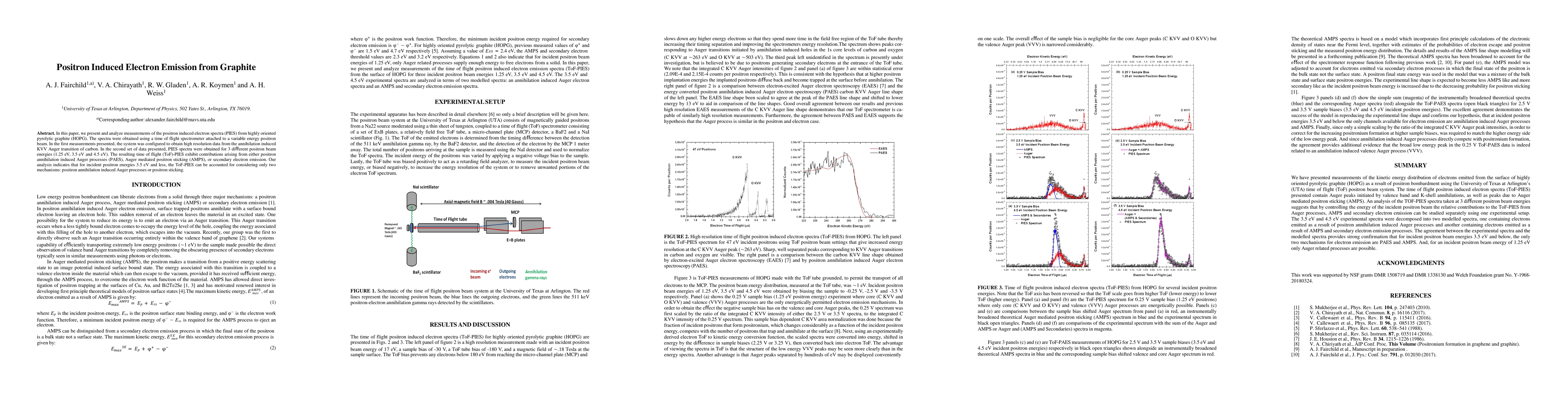 Researchers measured positron-induced electron emission from graphite, finding that low-energy positrons (3.5 eV) only show two effects: Auger processes or sticking, while higher energies reveal additional mechanisms.