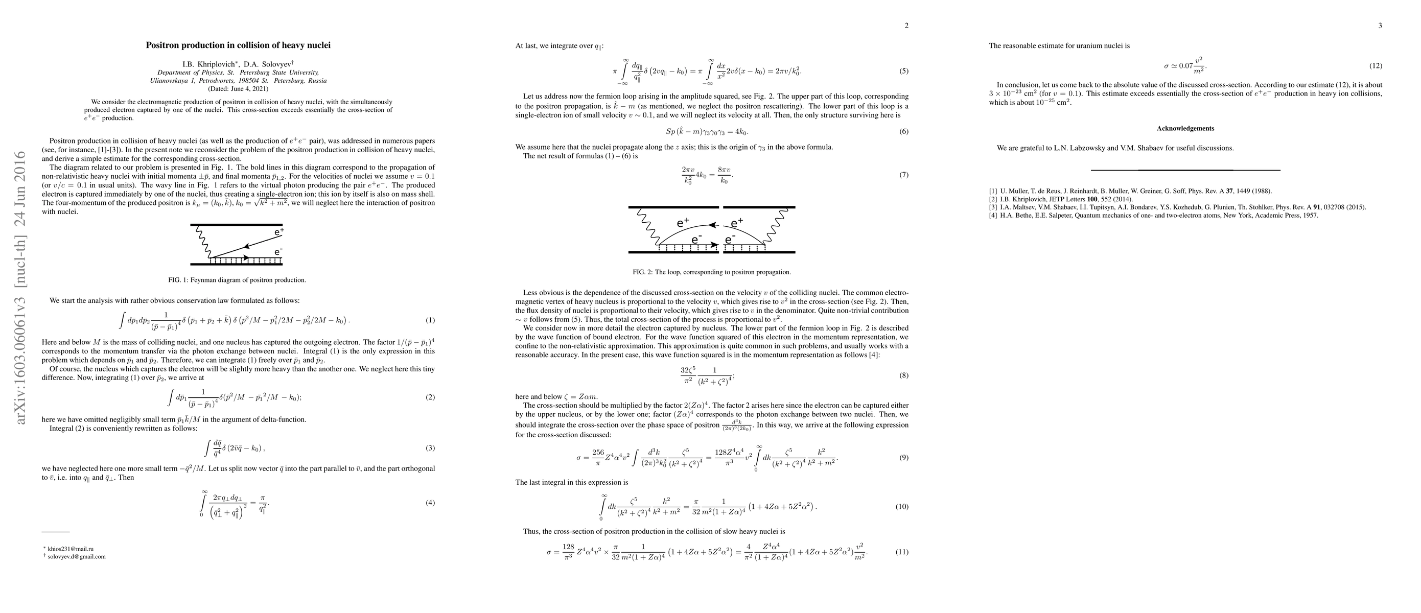 We consider the electromagnetic production of positron in collision of heavy nuclei, with the simultaneously produced electron captured by one of the nuclei. This cross-section exceeds by about four orders of magnitude the cross-section of $e^+ e^-$ production.