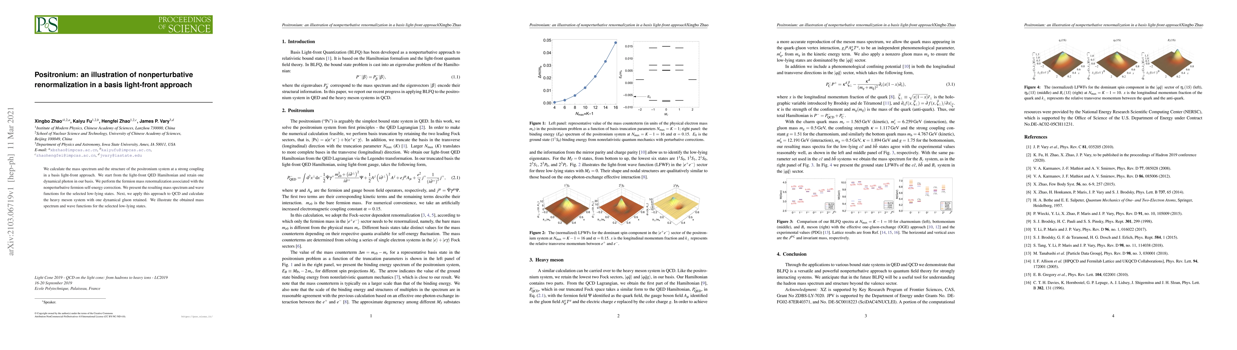 This paper calculates the mass spectrum and structure of positronium using a basis light-front approach, focusing on nonperturbative renormalization and including one dynamical photon. It extends the method to QCD, analyzing the heavy meson system with one dynamical gluon, presenting mass spectra and wave functions for low-lying states.