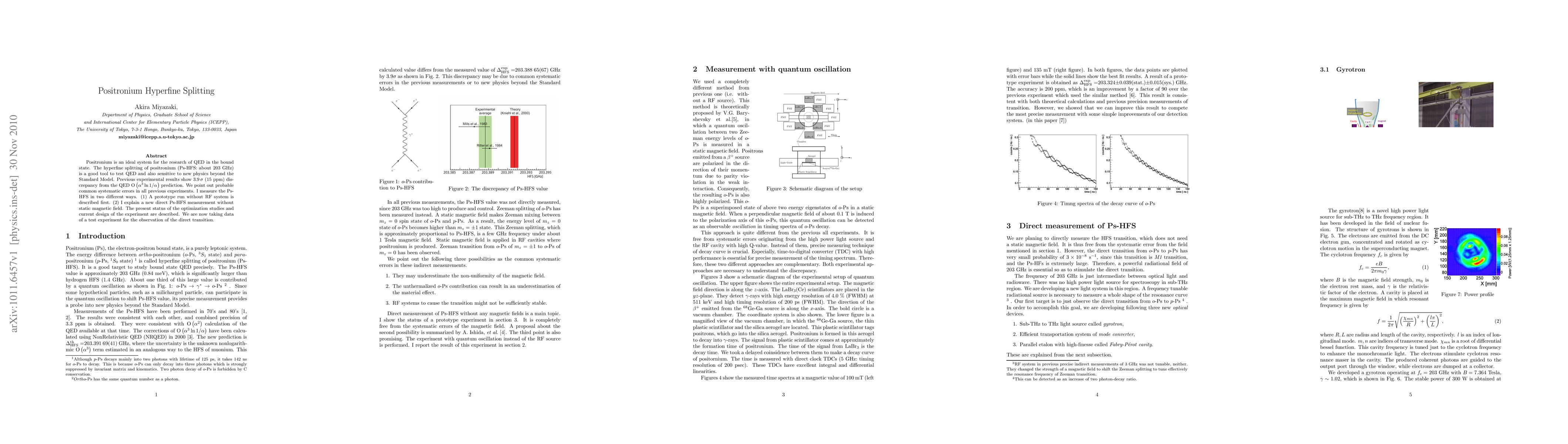 This paper investigates the hyperfine splitting of positronium to test Quantum Electrodynamics (QED) and detect potential new physics. The author identifies systematic errors in previous experiments and presents two new methods for measuring positronium hyperfine splitting, aiming to resolve the 3.9 σ discrepancy from QED predictions.