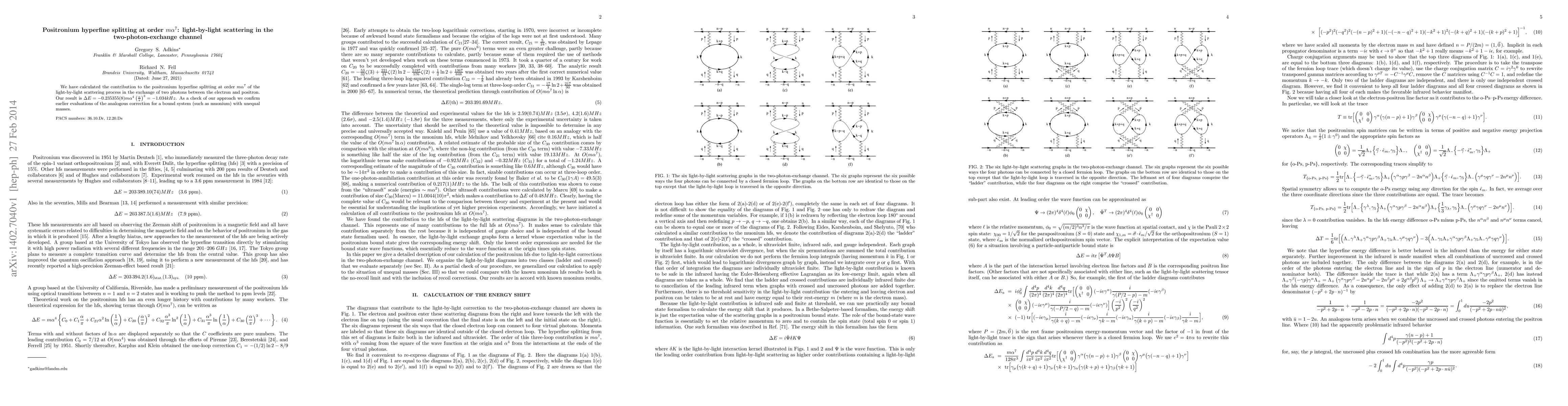 Researchers calculated a small effect on positronium hyperfine splitting due to light-by-light scattering in two-photon exchange, yielding a correction of -1.034 kHz.
