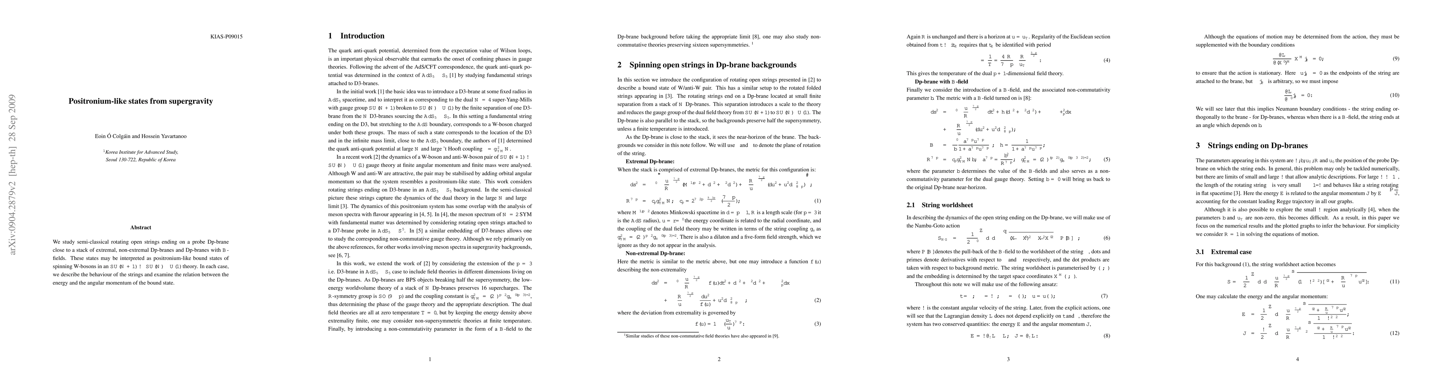This paper investigates semi-classical rotating open strings near Dp-branes, revealing positronium-like bound states of spinning W-bosons in an $SU(N+1)$ gauge theory. It examines the energy-angular momentum relationship in these states.