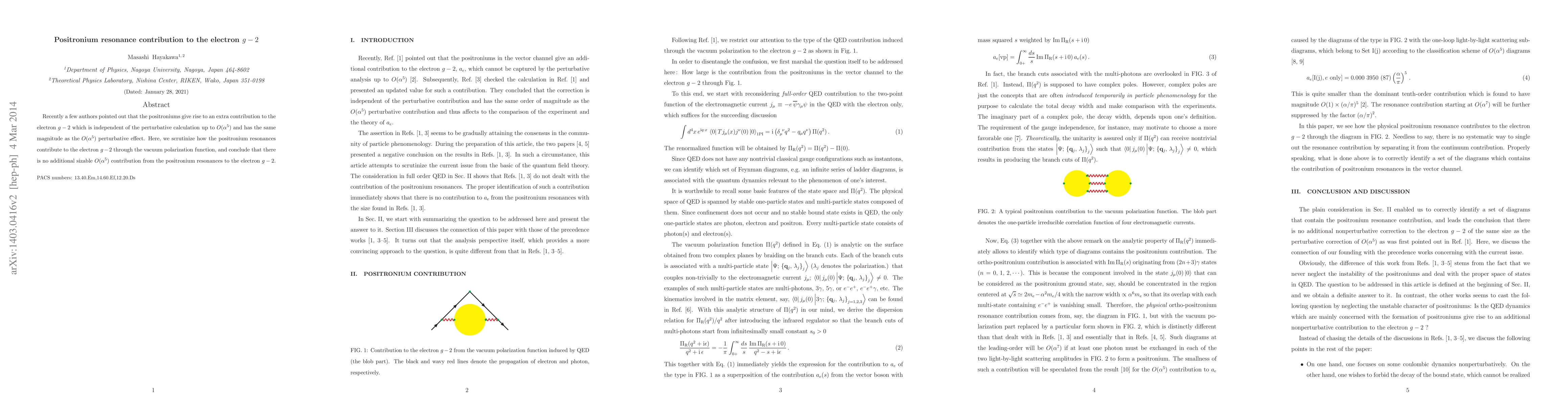 Recently a few authors pointed out that the positroniums give rise to an extra contribution to the electron $g-2$ with the magnitude comparable to the $O(\alpha^5)$ perturbative effect, which is not taken into account in the perturbative calculation up to $O(\alpha^5)$. Here, we scrutinize how the positronium resonances contribute to the electron $g-2$ through the vacuum polarization function, and conclude that there is no additional sizable $O(\alpha^5)$ contribution to the electron $g-2$.