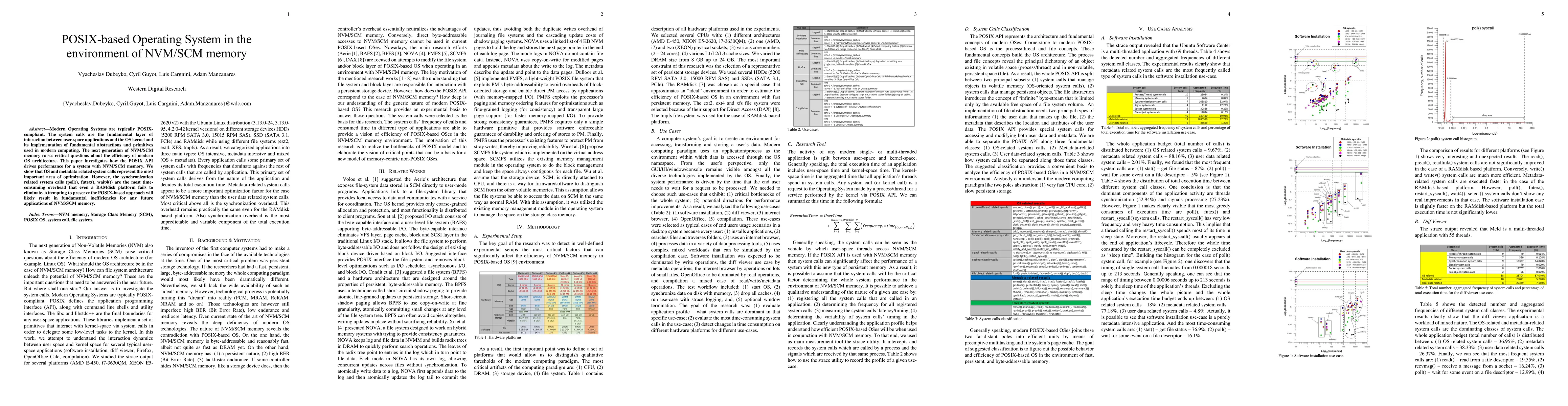 This paper examines the performance of POSIX-compliant OS systems in environments utilizing NVM/SCM memory, finding that while OS and metadata calls are crucial for optimization, synchronization calls like poll(), futex(), and wait4() create significant overhead, suggesting fundamental inefficiencies in POSIX-based systems for future NVM/SCM memory applications.