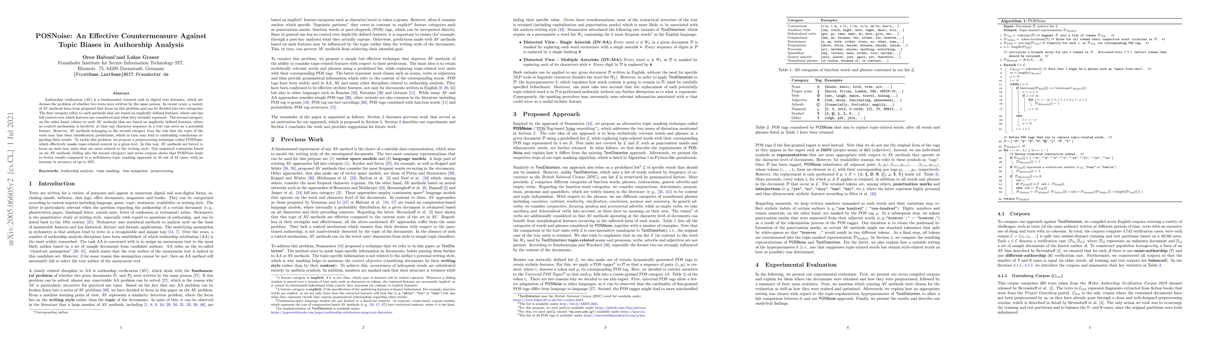 The paper introduces POSNoise, a preprocessing technique to mitigate topic biases in authorship verification (AV) methods based on implicitly defined features. Empirical results show that POSNoise improves AV accuracy by up to 10% compared to a well-known alternative, across six AV methods and seven corpora.