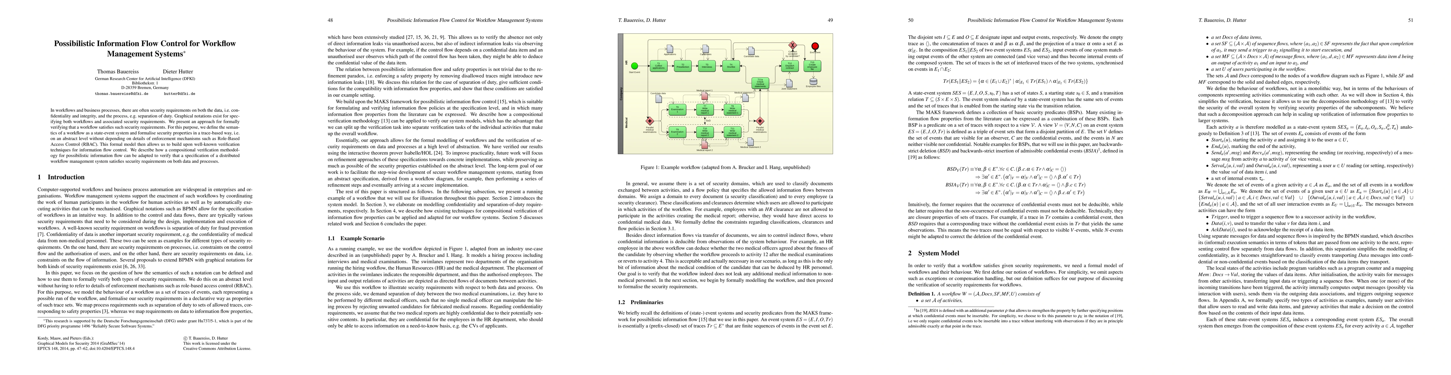 In workflows and business processes, there are often security requirements on both the data, i.e. confidentiality and integrity, and the process, e.g. separation of duty. Graphical notations exist for specifying both workflows and associated security requirements. We present an approach for formally verifying that a workflow satisfies such security requirements. For this purpose, we define the semantics of a workflow as a state-event system and formalise security properties in a trace-based way, i.e. on an abstract level without depending on details of enforcement mechanisms such as Role-Based Access Control (RBAC). This formal model then allows us to build upon well-known verification techniques for information flow control. We describe how a compositional verification methodology for possibilistic information flow can be adapted to verify that a specification of a distributed workflow management system satisfies security requirements on both data and processes.