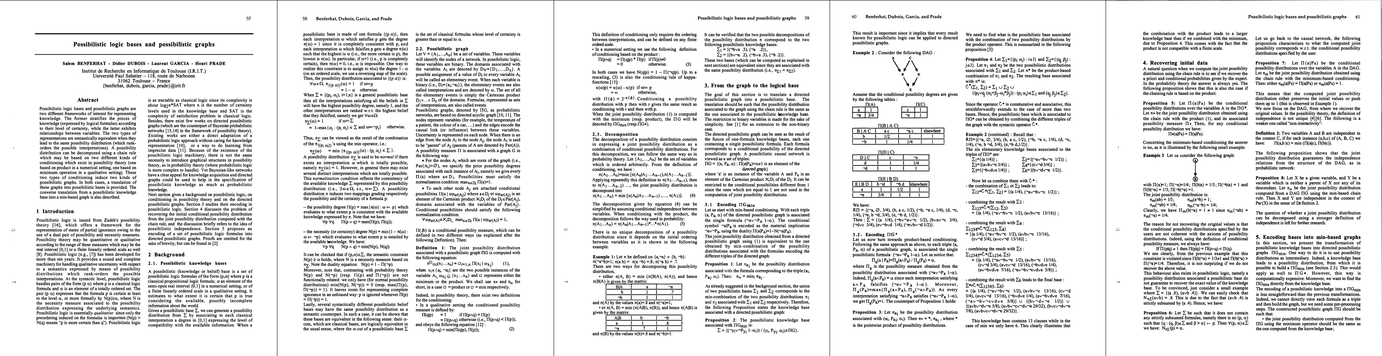 This paper explores the equivalence between possibilistic logic bases and possibilistic graphs, two frameworks for representing knowledge based on certainty levels and variable relationships, respectively. It introduces two types of conditioning in possibility theory and describes translations between these representations.