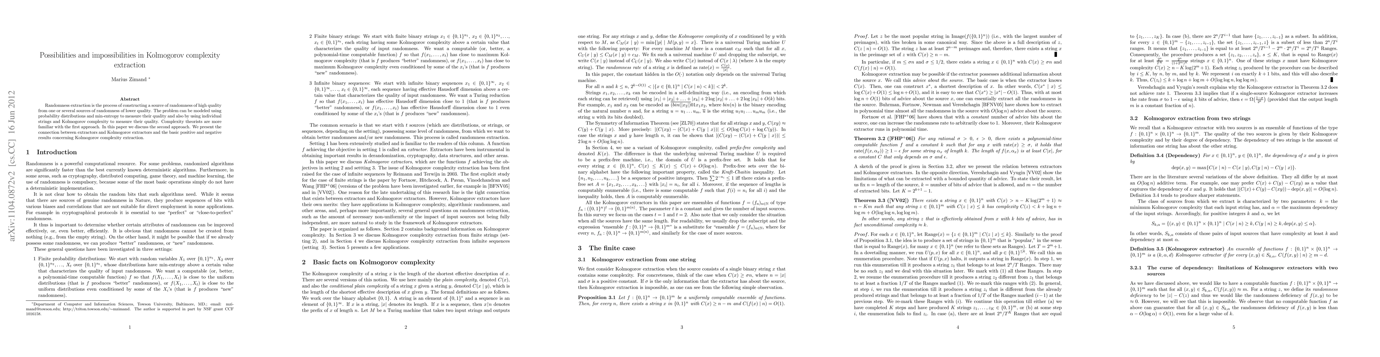 Randomness extraction is the process of constructing a source of randomness of high quality from one or several sources of randomness of lower quality. The problem can be modeled using probability distributions and min-entropy to measure their quality and also by using individual strings and Kolmogorov complexity to measure their quality. Complexity theorists are more familiar with the first approach. In this paper we survey the second approach. We present the connection between extractors and Kolmogorov extractors and the basic positive and negative results concerning Kolmogorov complexity extraction.