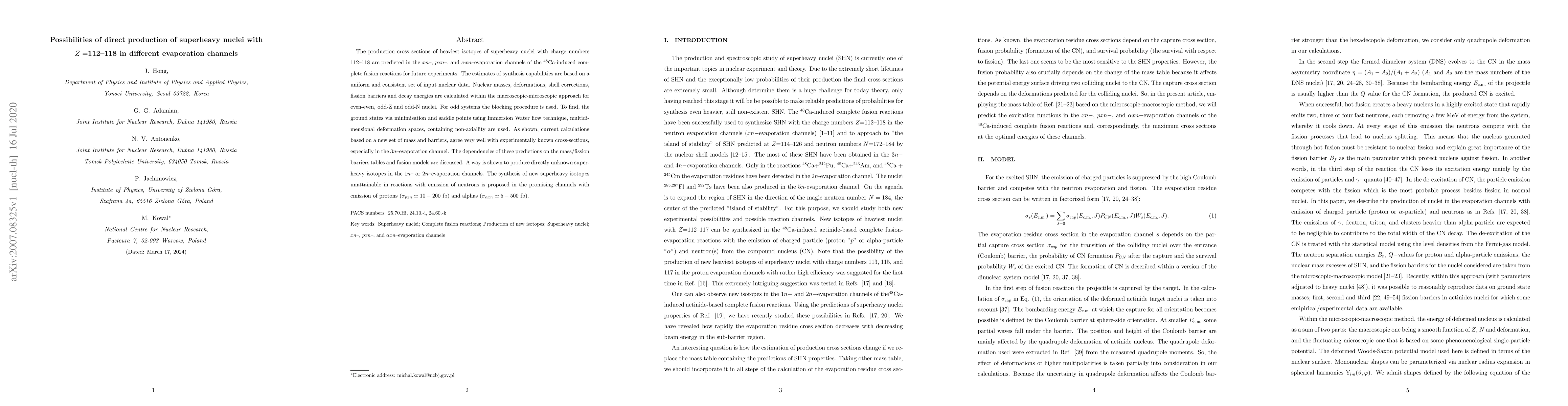 The production cross sections of heaviest isotopes of superheavy nuclei with charge numbers 112--118 are predicted in the $xn$--, $pxn$--, and $\alpha xn$--evaporation channels of the $^{48}$Ca-induced complete fusion reactions for future experiments. The estimates of synthesis capabilities are based on a uniform and consistent set of input nuclear data. Nuclear masses, deformations, shell corrections, fission barriers, and decay energies are calculated within the macroscopic-microscopic approach for even-even, odd-Z, and odd-N nuclei. For odd systems, the blocking procedure is used. To find, the ground states via minimization and saddle points using Immersion Water flow technique, multidimensional deformation spaces, containing non-axially are used. As shown, current calculations based on a new set of mass and barriers, agree very well with experimentally known cross-sections, especially in the $3n$--evaporation channel. The dependencies of these predictions on the mass/fission barriers tables and fusion models are discussed. A way is shown to produce directly unknown superheavy isotopes in the $1n$-- or $2n$--evaporation channels. The synthesis of new superheavy isotopes unattainable in reactions with emission of neutrons is proposed in the promising channels with emission of protons ($\sigma_{pxn} \simeq 10-200$ fb) and alphas ($\sigma_{\alpha xn} \simeq 5-500$ fb).