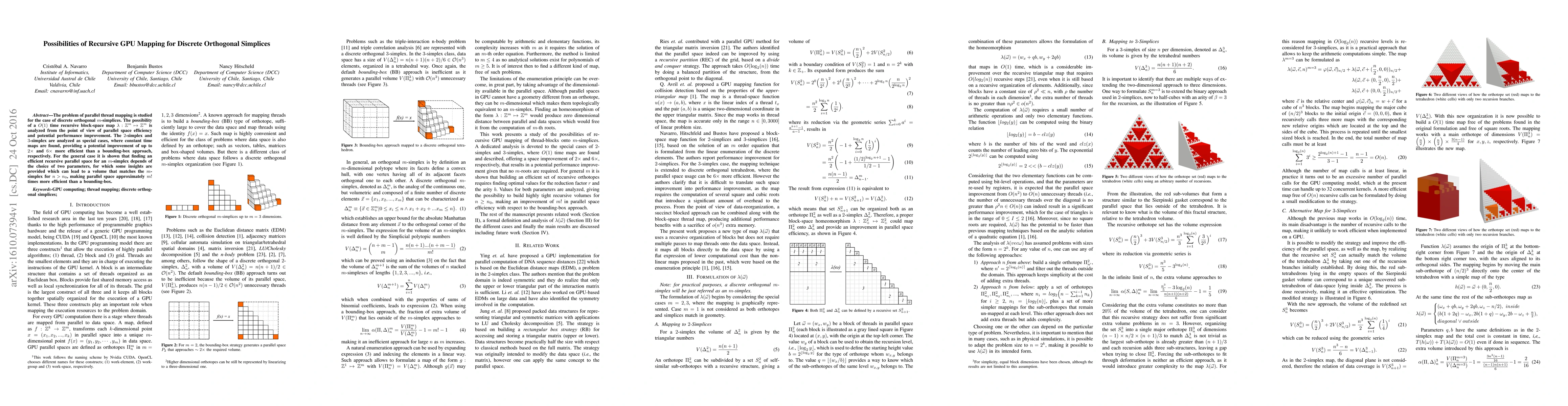The problem of parallel thread mapping is studied for the case of discrete orthogonal $m$-simplices. The possibility of a $O(1)$ time recursive block-space map $\lambda: \mathbb{Z}^m \mapsto \mathbb{Z}^m$ is analyzed from the point of view of parallel space efficiency and potential performance improvement. The $2$-simplex and $3$-simplex are analyzed as special cases, where constant time maps are found, providing a potential improvement of up to $2\times$ and $6\times$ more efficient than a bounding-box approach, respectively. For the general case it is shown that finding an efficient recursive parallel space for an $m$-simplex depends of the choice of two parameters, for which some insights are provided which can lead to a volume that matches the $m$-simplex for $n>n_0$, making parallel space approximately $m!$ times more efficient than a bounding-box.