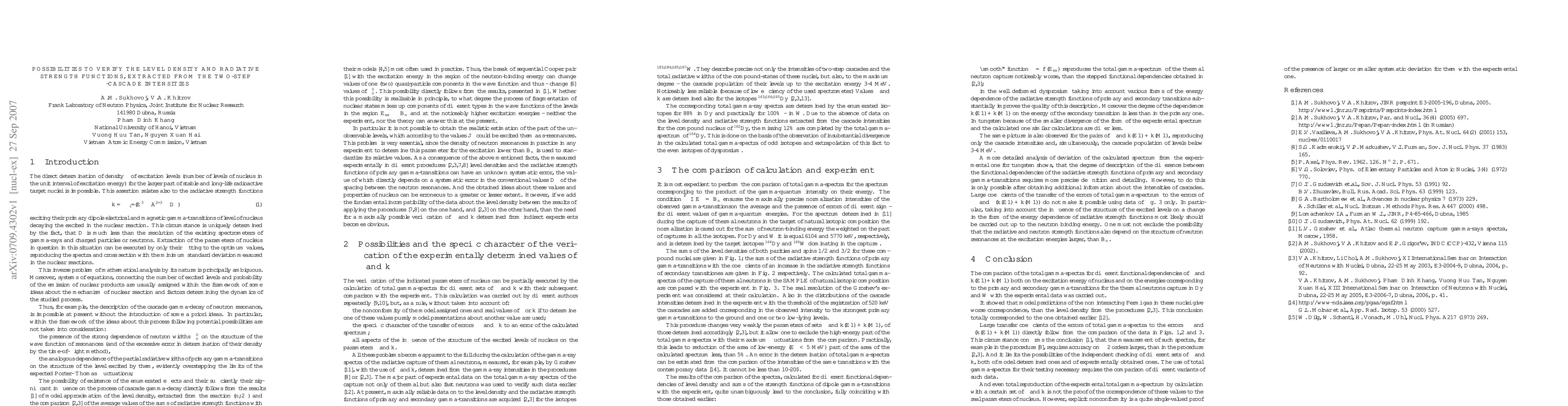 The direct determination of the excitation level density and radiative strength functions of their exciting gamma-transitions is impossible for the larger part of the stable and long-life radioactive target nuclei. This circumstance is uniquely determined by the fact, that the level spacing much less than the resolution of the existing spectrometers of gamma-rays and charged particles. The extraction of these parameters of nucleus in this situation can be executed by their only fitting to the most probable values, reproducing the measured in the nuclear reactions spectra and sections. This inverse problem of mathematical analysis of its nature is principally ambiguous. Moreover, system of equations, those connecting the number of excitable levels and probability of the emission of charge particles are assigned usually within the framework of some assumptions about the mechanism of nuclear reaction and factors, determining the dynamics of the studied process. The verification of these parameters can be partially executed by the calculation of total gamma-spectra for their different sets. As, in particular, the results of this analysis show, the calculation of the structure of the excited levels to a change in the form of the energy dependence of radiative strength functions most likely must be considered to the neutron-binding energy. It is not possible to exclude the possibility of that, that also radiative, and neutron strength functions depend on the structure of neutron resonance and for the higher excitation energies.
