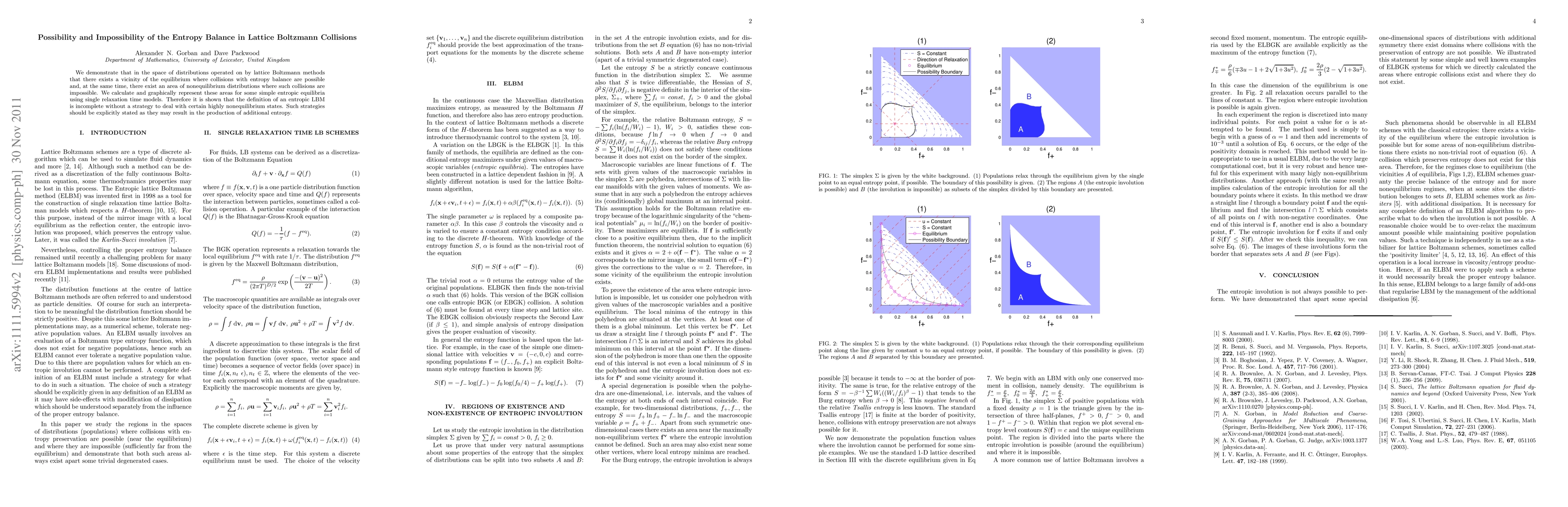 We demonstrate that in the space of distributions operated on by lattice Boltzmann methods that there exists a vicinity of the equilibrium where collisions with entropy balance are possible and, at the same time, there exist an area of nonequilibrium distributions where such collisions are impossible. We calculate and graphically represent these areas for some simple entropic equilibria using single relaxation time models. Therefore it is shown that the definition of an entropic LBM is incomplete without a strategy to deal with certain highly nonequilibrium states. Such strategies should be explicitly stated as they may result in the production of additional entropy.