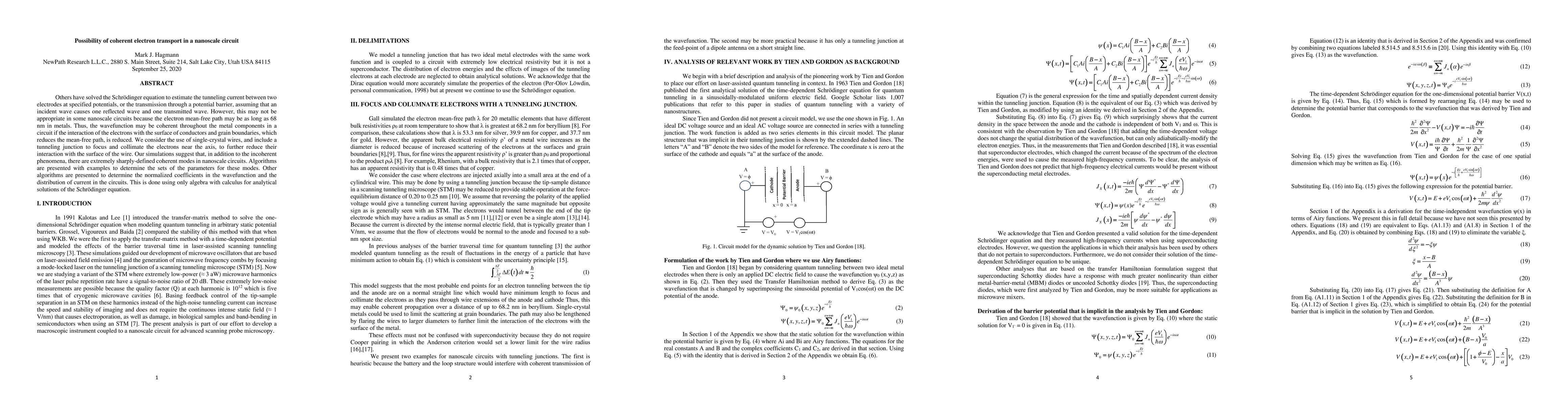 Others have solved the Schr\"odinger equation to estimate the tunneling current between two electrodes at specified potentials, or the transmission through a potential barrier, assuming that an incident wave causes one reflected wave and one transmitted wave. However, this may not be appropriate in some nanoscale circuits because the electron mean-free path may be as long as 68 nm in metals. Thus, the wavefunction may be coherent throughout the metal components in a circuit if the interaction of the electrons with the surface of conductors and grain boundaries, which reduces the mean-free path, is reduced. We consider the use of single-crystal wires, and include a tunneling junction to focus and collimate the electrons near the axis, to further reduce their interaction with the surface of the wire. Our simulations suggest that, in addition to the incoherent phenomena, there are extremely sharply-defined coherent modes in nanoscale circuits. Algorithms are presented with examples to determine the sets of the parameters for these modes. Other algorithms are presented to determine the normalized coefficients in the wavefunction and the distribution of current in the circuits. This is done using only algebra with calculus for analytical solutions of the Schr\"odinger equation.