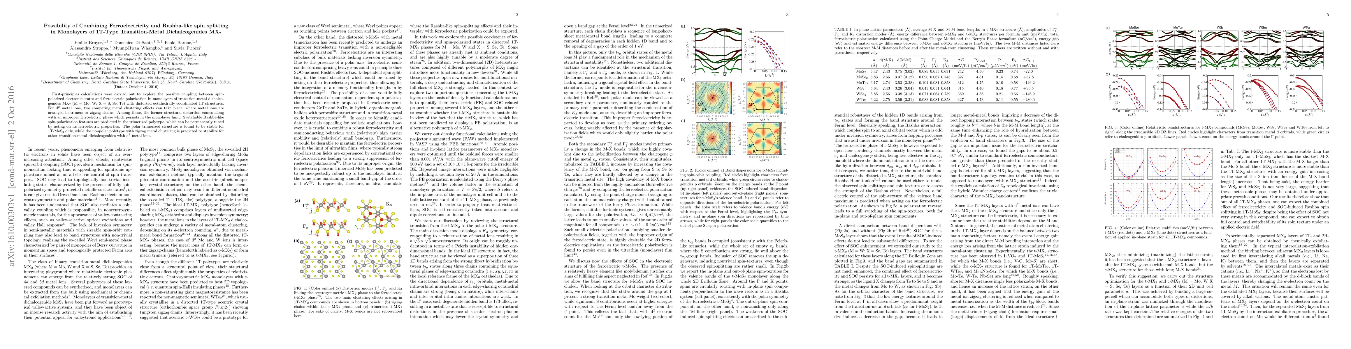 First-principles calculations were carried out to explore the possible coupling between spin-polarized electronic states and ferroelectric polarization in monolayers of transition-metal dichalcogenides MX 2 (M = Mo, W; X = S, Se, Te) with distorted octahedrally coordinated 1T structures.For d^2 metal ions, two competing metal clustering effects can take place, where metal ions are arranged in trimers or zigzag chains. Among these, the former structural distortion comes along with an improper ferroelectric phase which persists in the monolayer limit. Switchable Rashba-like spin-polarization features are predicted in the trimerized polytype, which can be permanently tuned by acting on its ferroelectric properties. The polar trimerized structure is found to be stable for 1T-MoS 2 only, while the nonpolar polytype with zigzag metal clustering is predicted to stabilize for other transition-metal dichalcogenides with d 2 metal ions.