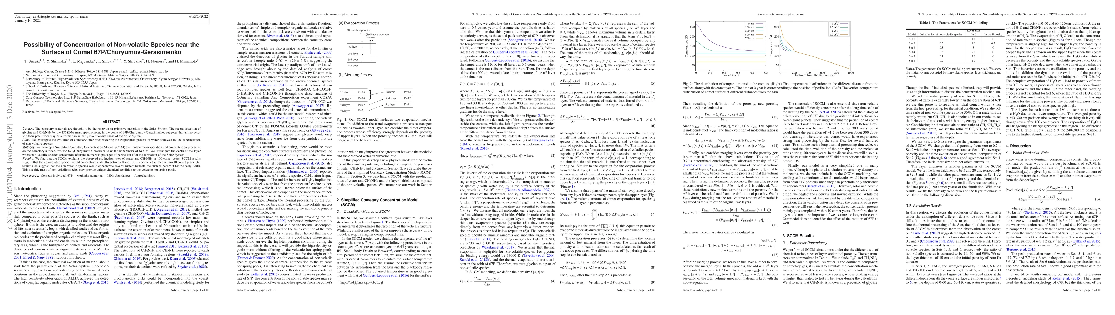 The cometary materials are thought to be the reservoir of primitive materials in the Solar System. The recent detection of glycine and CH$_3$NH$_2$ by the ROSINA mass spectrometer in the coma of 67P/Churyumov-Gerasimenko suggests that amino acids and their precursors may have been formed in an early evolutionary phase of the Solar System. We investigate the evolution of cometary interior considering the evaporation process of water followed by the concentration of non-volatile species. We develop a Simplified Cometary Concentration Model (SCCM) to simulate the evaporation and concentration processes on the cometary surface.We use 67P/Churyumov-Gerasimenko as the benchmark of SCCM. We investigate the depth of the layer where non-volatile species concentrate after the numerous passages of perihelion after the formation of the Solar System. As a result, the SCCM explains the observed production rates of water and CH$_3$NH$_2$ at 100 comet years. SCCM results suggest that the non-volatile species would concentrate at depths between 0 and 100cm of comet surface within 10 comet years. Our results also suggest that the non-volatile species would concentrate several meters beneath the surface before it hit the early Earth. This specific mass of non-volatile species may provide unique chemical condition to the volcanic hot spring pools.