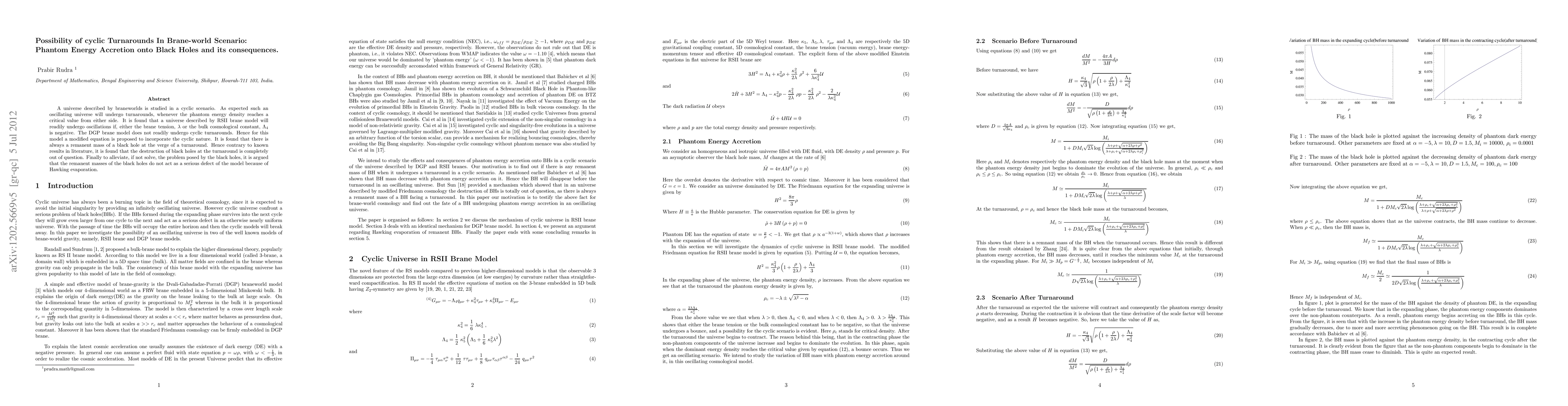 This paper explores cyclic universes in braneworld scenarios, particularly focusing on phantom energy and black hole dynamics. It finds that RSII brane models can easily undergo cyclic turnarounds with negative brane tension or bulk cosmological constant, while DGP brane models require modifications. Notably, black holes do not get destroyed at turnarounds, and their remnant masses are not problematic due to Hawking evaporation.