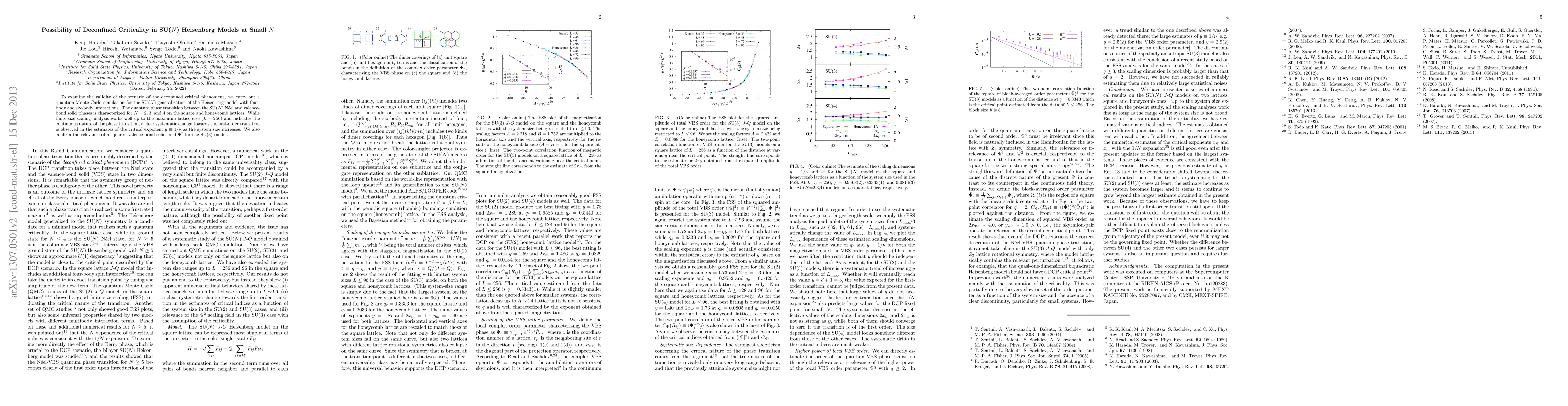 To examine the validity of the scenario of the deconfined critical phenomena, we carry out a quantum Monte Carlo simulation for the SU($N$) generalization of the Heisenberg model with four-body and six-body interactions. The quantum phase transition between the SU($N$) N\'eel and valence-bond solid phases is characterized for $N=2,3,$ and $4$ on the square and honeycomb lattices. While finite-size scaling analysis works well up to the maximum lattice size ($L=256$) and indicates the continuous nature of the phase transition, a clear systematic change towards the first-order transition is observed in the estimates of the critical exponent $y \equiv 1/\nu$ as the system size increases. We also confirm the relevance of a squared valence-bond solid field $\Psi^2$ for the SU(3) model.