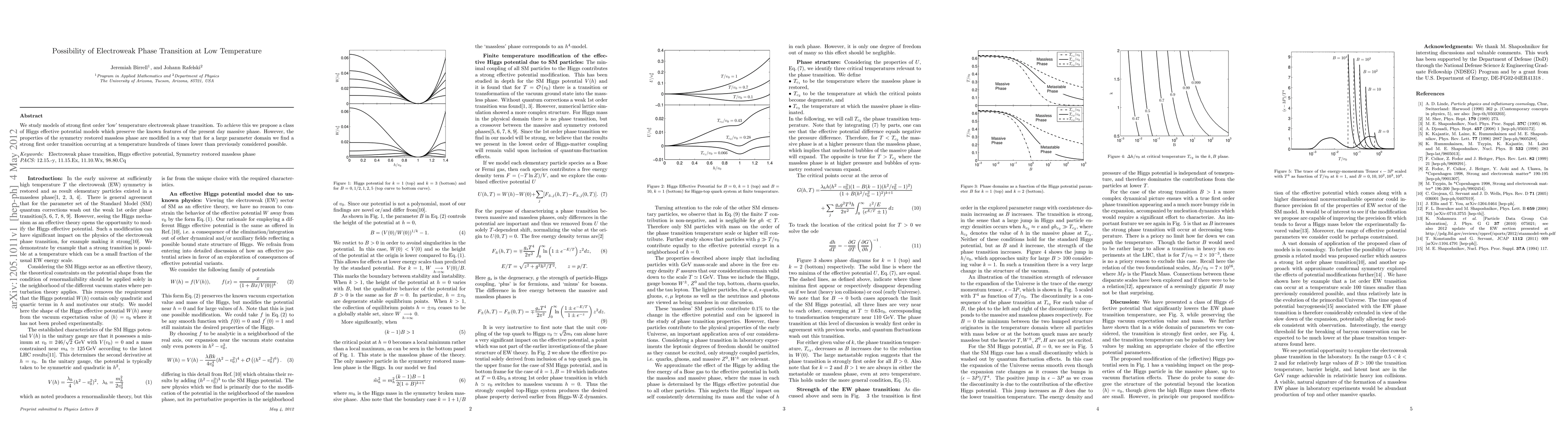 We study models of strong first order `low' temperature electroweak phase transition. To achieve this we propose a class of Higgs effective potential models which preserve the known features of the present day massive phase. However, the properties of the symmetry restored massless phase are modified in a way that for a large parameter domain we find a strong first order transition occurring at a temperature hundreds of times lower than previously considered possible.