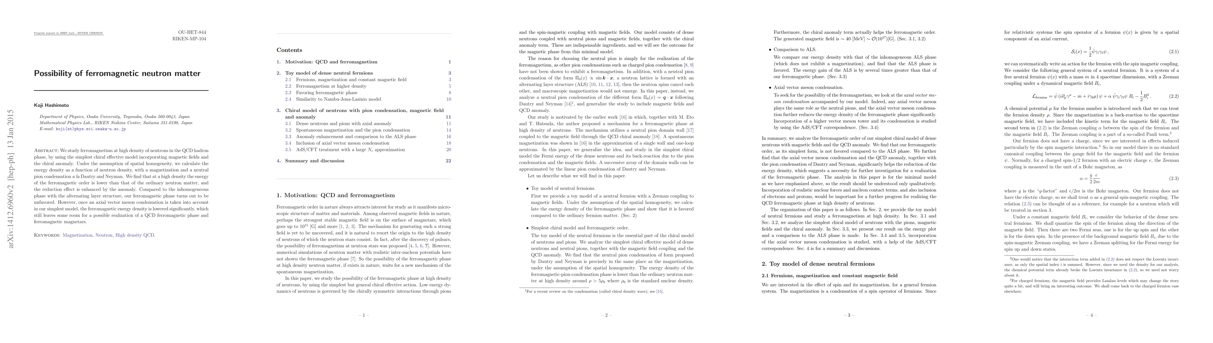 We study ferromagnetism at high density of neutrons in the QCD hadron phase, by using the simplest chiral effective model incorporating magnetic fields and the chiral anomaly. Under the assumption of spatial homogeneity, we calculate the energy density as a function of neutron density, with a magnetization and a neutral pion condensation a la Dautry and Neyman. We find that at a high density the energy of the ferromagnetic order is lower than that of the ordinary neutron matter, and the reduction effect is enhanced by the anomaly. Compared to the inhomogeneous phase with the alternating layer structure, our ferromagnetic phase turns out to be unfavored. However, once an axial vector meson condensation is taken into account in our simplest model, the ferromagnetic energy density is lowered significantly, which still leaves some room for a possible realization of a QCD ferromagnetic phase and ferromagnetic magnetars.