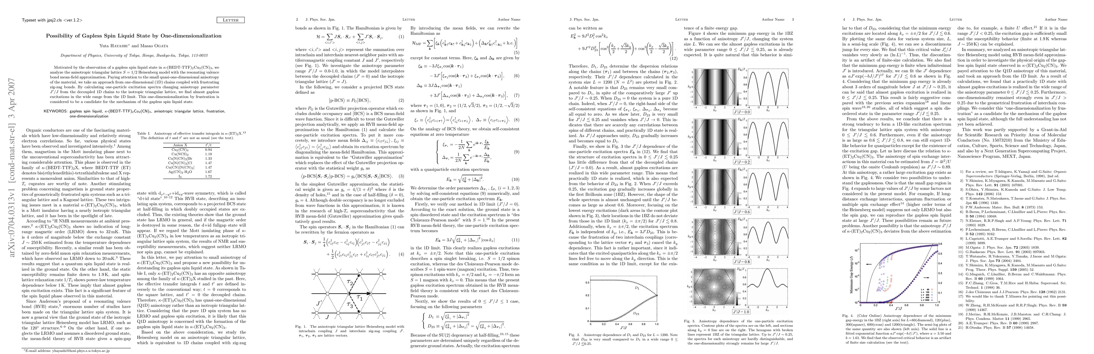 This paper investigates the possibility of a gapless spin liquid state through the one-dimensionalization of an anisotropic triangular lattice model, finding almost gapless excitations over a wide range of anisotropies, suggesting a potential mechanism for the observed gapless spin liquid state in $\kappa$-(BEDT-TTF)$_2$Cu$_2$(CN)$_3$.
