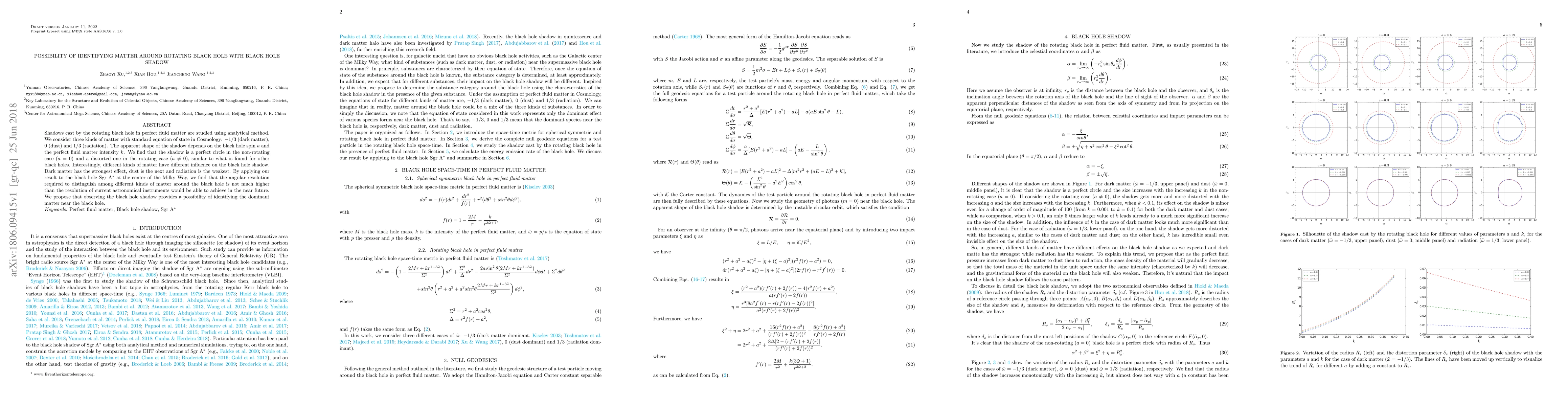 Shadows cast by the rotating black hole in perfect fluid matter are studied using analytical method. We consider three kinds of matter with standard equation of state in Cosmology: $-1/3$ (dark matter), 0 (dust) and $1/3$ (radiation). The apparent shape of the shadow depends on the black hole spin $a$ and the perfect fluid matter intensity $k$. We find that the shadow is a perfect circle in the non-rotating case ($a=0$) and a distorted one in the rotating case ($a\neq0$), similar to what is found for other black holes. Interestingly, different kinds of matter have different influence on the black hole shadow. Dark matter has the strongest effect, dust is the next and radiation is the weakest. By applying our result to the black hole Sgr A$^{*}$ at the center of the Milky Way, we find that the angular resolution required to distinguish among different kinds of matter around the black hole is not much higher than the resolution of current astronomical instruments would be able to achieve in the near future. We propose that observing the black hole shadow provides a possibility of identifying the dominant matter near the black hole.