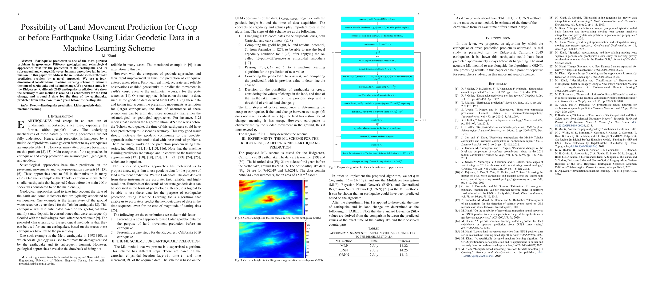 This paper proposes a machine learning scheme using Lidar geodetic data to predict the time and land movement associated with earthquakes, achieving an accuracy of 14 cm for land change and 2 days for earthquake timing, demonstrated through the Ridgecrest, California 2019 earthquake.