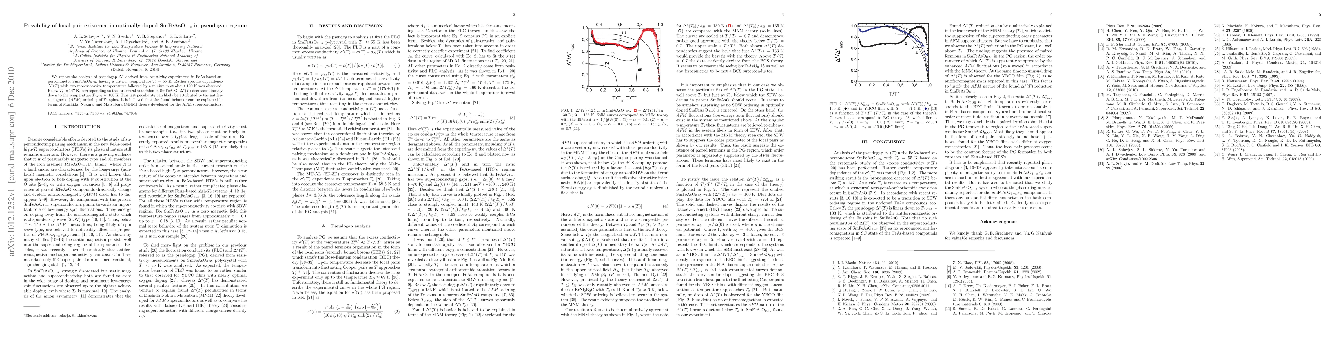 We report the analysis of pseudogap Delta* derived from resistivity experiments in FeAs-based superconductor SmFeAsO(0.85), having a critical temperature T_c = 55 K. Rather specific dependence Delta*(T) with two representative temperatures followed by a minimum at about 120 K was observed. Below T_s = 147 K, corresponding to the structural transition in SmFeAsO, Delta*(T) decreases linearly down to the temperature T_AFM = 133 K. This last peculiarity can likely be attributed to the antiferromagnetic (AFM) ordering of Fe spins. It is believed that the found behavior can be explained in terms of Machida, Nokura, and Matsubara (MNM) theory developed for the AFM superconductors.