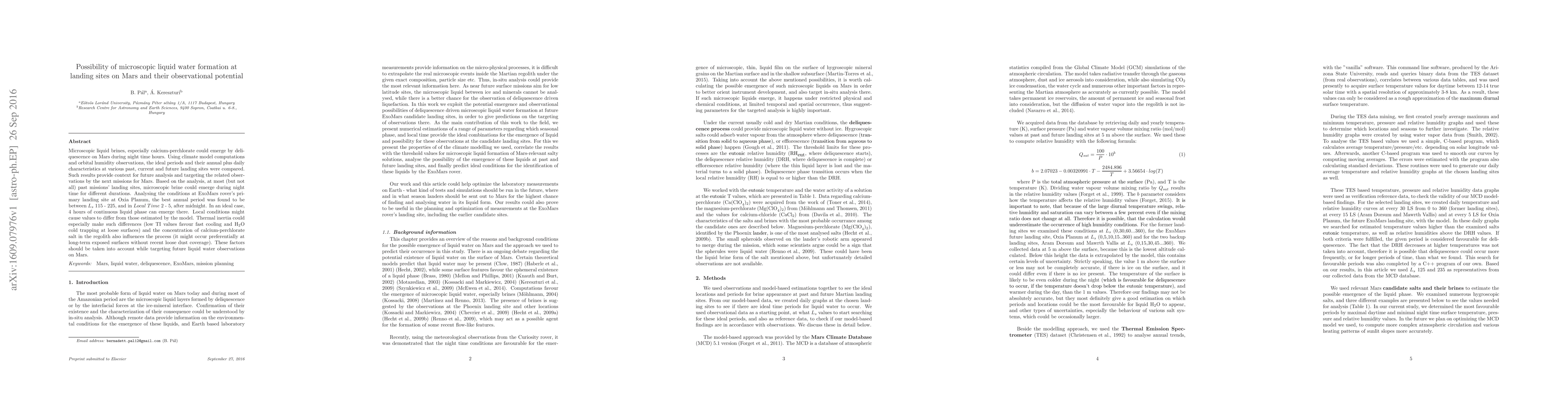 Microscopic liquid brines, especially calcium-perchlorate could emerge by deliquescence on Mars during night time hours. Using climate model computations and orbital humidity observations, the ideal periods and their annual plus daily characteristics at various past, current and future landing sites were compared. Such results provide context for future analysis and targeting the related observations by the next missions for Mars. Based on the analysis, at most (but not all) past missions' landing sites, microscopic brine could emerge during night time for different durations. Analysing the conditions at ExoMars rover's primary landing site at Oxia Planum, the best annual period was found to be between $L_s$ 115 - 225, and in $Local\hspace{0.1cm} Time$ 2 - 5, after midnight. In an ideal case, 4 hours of continuous liquid phase can emerge there. Local conditions might cause values to differ from those estimated by the model. Thermal inertia could especially make such differences (low TI values favour fast cooling and $\textrm{H}_2\textrm{O}$ cold trapping at loose surfaces) and the concentration of calcium-perchlorate salt in the regolith also influences the process (it might occur preferentially at long-term exposed surfaces without recent loose dust coverage). These factors should be taken into account while targeting future liquid water observations on Mars.