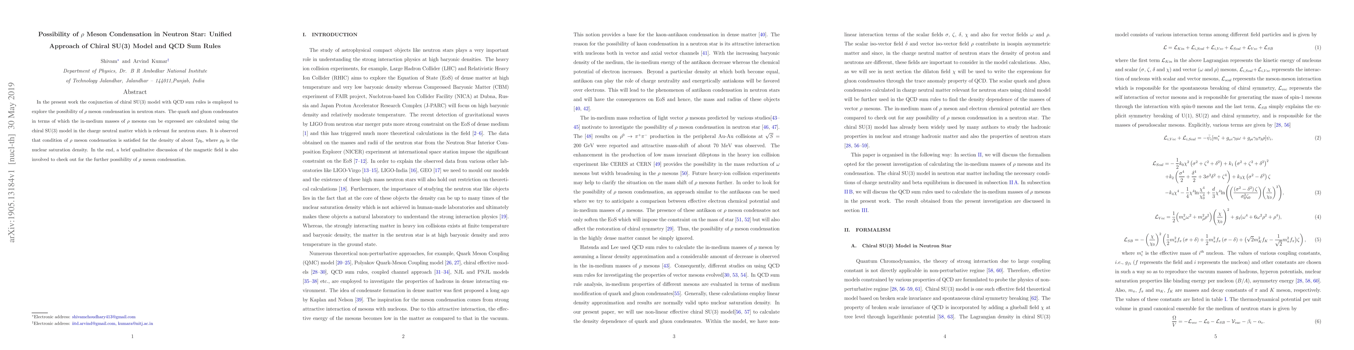 In the present work the conjunction of chiral SU(3) model with QCD sum rules is employed to explore the possibility of $\rho$ meson condensation in neutron stars. The quark and gluon condensates in terms of which the in-medium masses of $\rho$ mesons can be expressed are calculated using the chiral SU(3) model in the charge neutral matter which is relevant for neutron stars. It is observed that condition of $\rho$ meson condensation is satisfied for the density of about 7$\rho_{0}$, where $\rho_{0}$ is the nuclear saturation density. In the end, a brief qualitative discussion of the magnetic field is also involved to check out for the further possibility of $\rho$ meson condensation.