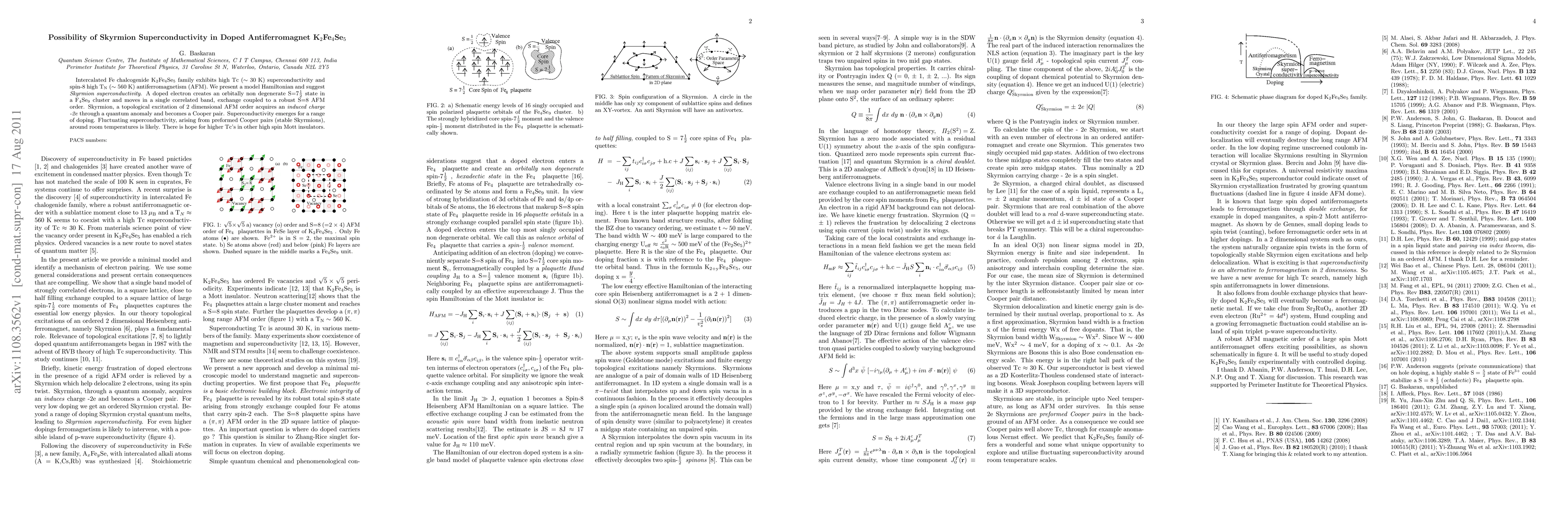 Intercalated Fe chalcogenide K$_2$Fe$_4$Se$_5$ family exhibits high Tc ($\sim$ 30 K) superconductivity and spin-8 high T$_{\rm N}$ ($\sim$ 560 K) antiferromagnetism (AFM). We present a model Hamiltonian and suggest \textit{Skyrmion superconductivity}. A doped electron creates an orbitally non degenerate S=7\half state in a F$_4$Se$_9$ cluster and moves in a single correlated band, exchange coupled to a robust S=8 AFM order. Skyrmion, a topological excitation of 2 dimensional AFM order acquires an \textit{induced charge -2e} through a quantum anomaly and becomes a Cooper pair. Superconductivity emerges for a range of doping. Fluctuating superconductivity, arising from preformed Cooper pairs (stable Skyrmions), around room temperatures is predicted. We offer hope for higher Tc's in large-S Mott insulators.