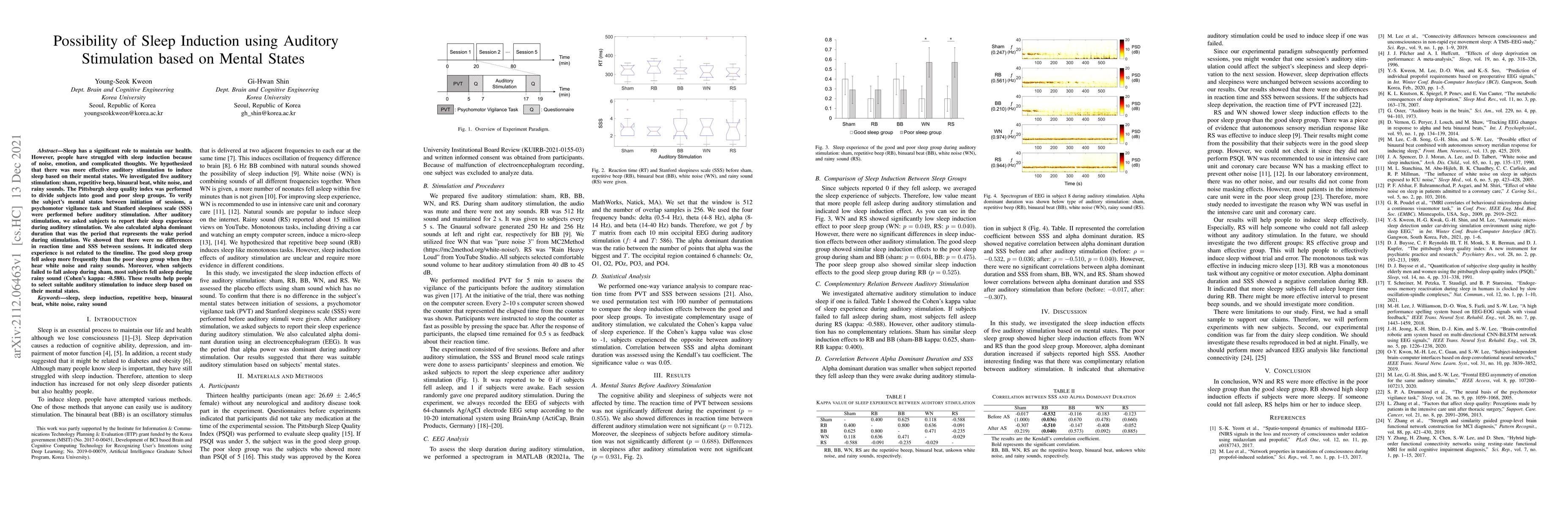 This study explores the effectiveness of various auditory stimuli (repetitive beep, binaural beat, white noise, rainy sounds) for sleep induction based on mental states, finding that white noise and rainy sounds were more effective for individuals with good sleep quality compared to those with poor sleep quality. The results suggest tailored auditory stimulation can enhance sleep induction.