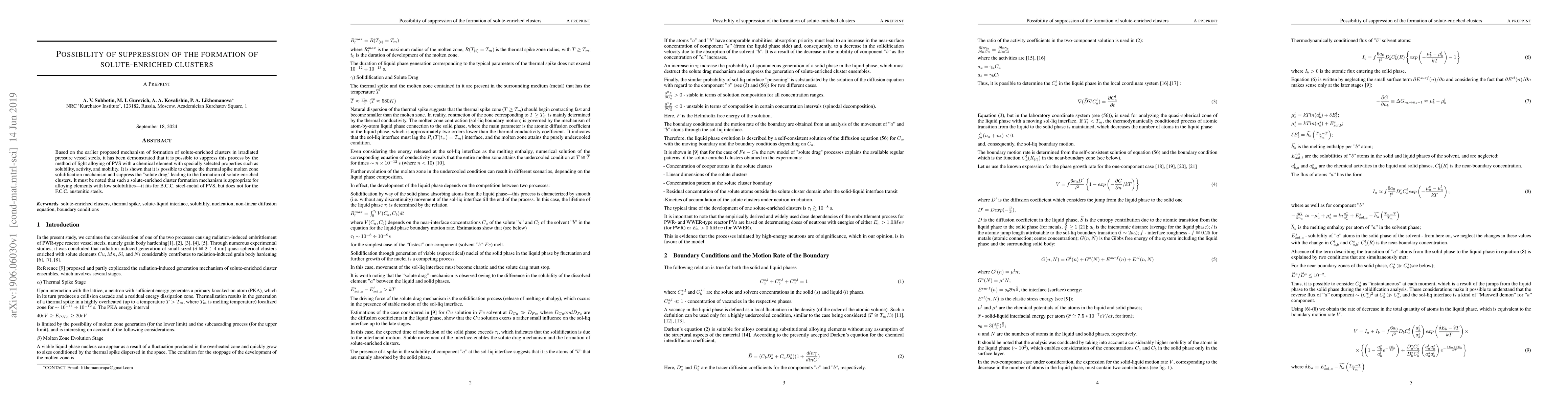 This paper demonstrates the potential to suppress the formation of solute-enriched clusters in irradiated pressure vessel steels through light alloying with elements chosen for specific solubility, activity, and mobility properties. This method alters the solidification mechanism to prevent "solute drag," though it is effective for B.C.C. steels but not for F.C.C. austenitic steels.