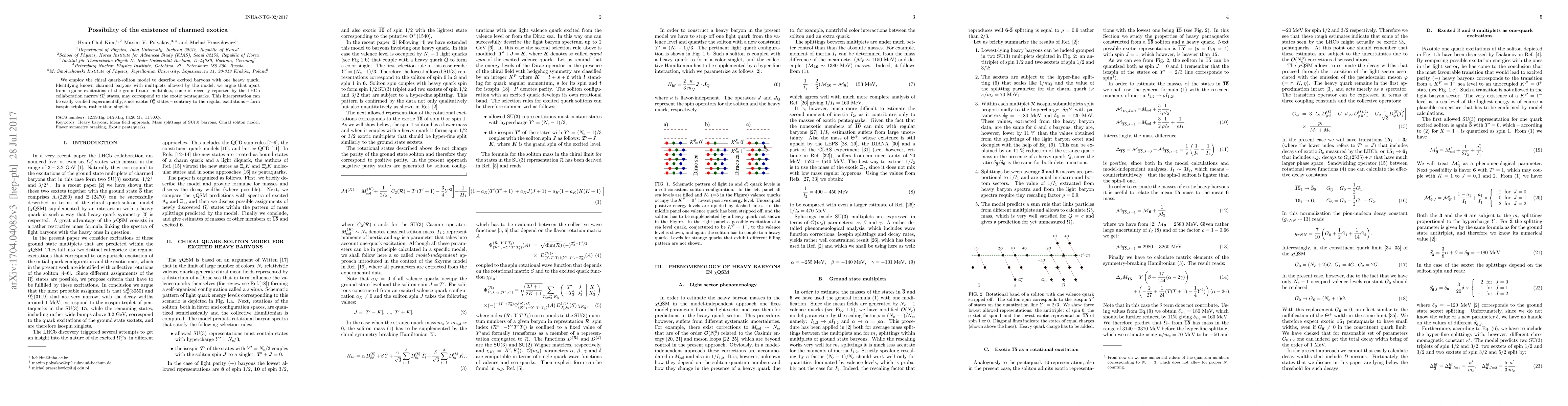 We employ the chiral quark-soliton model to describe excited baryons with one heavy quark. Identifying known charmed baryons with multiplets allowed by the model, we argue that apart from regular excitations of the ground state multiplets, some of recently reported by the LHCb collaboration narrow $\Omega^{0}_{c}$ states, may correspond to the exotic pentaquarks. This interpretation can be easily verified experimentally, since exotic $\Omega^{0}_{c}$ states -- contrary to the regular excitations -- form isospin triplets, rather than singlets.