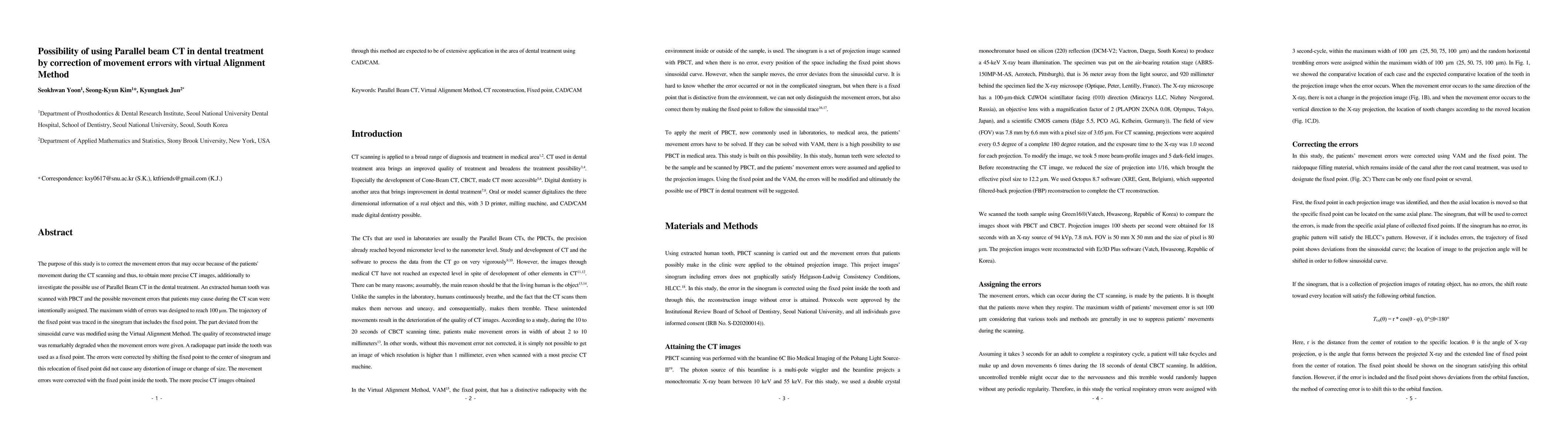 The purpose of this study is to correct the movement errors that may occur because of the patients' movement during the CT scanning and thus, to obtain more precise CT images, additionally to investigate the possible use of Parallel Beam CT in the dental treatment. An extracted human tooth was scanned with PBCT and the possible movement errors that patients may cause during the CT scan were intentionally assigned. The maximum width of errors was designed to reach 0.1 mm. The trajectory of the fixed point was traced in the sinogram that includes the fixed point. The part deviated from the sinusoidal curve was modified using the Virtual Alignment Method. The quality of reconstructed image was remarkably degraded when the movement errors were given. A radiopaque part inside the tooth was used as a fixed point. The errors were corrected by shifting the fixed point to the center of sinogram and this relocation of fixed point did not cause any distortion of image or change of size. The movement errors were corrected with the fixed point inside the tooth. The more precise CT images obtained through this method are expected to be of extensive application in the area of dental treatment using CAD/CAM.