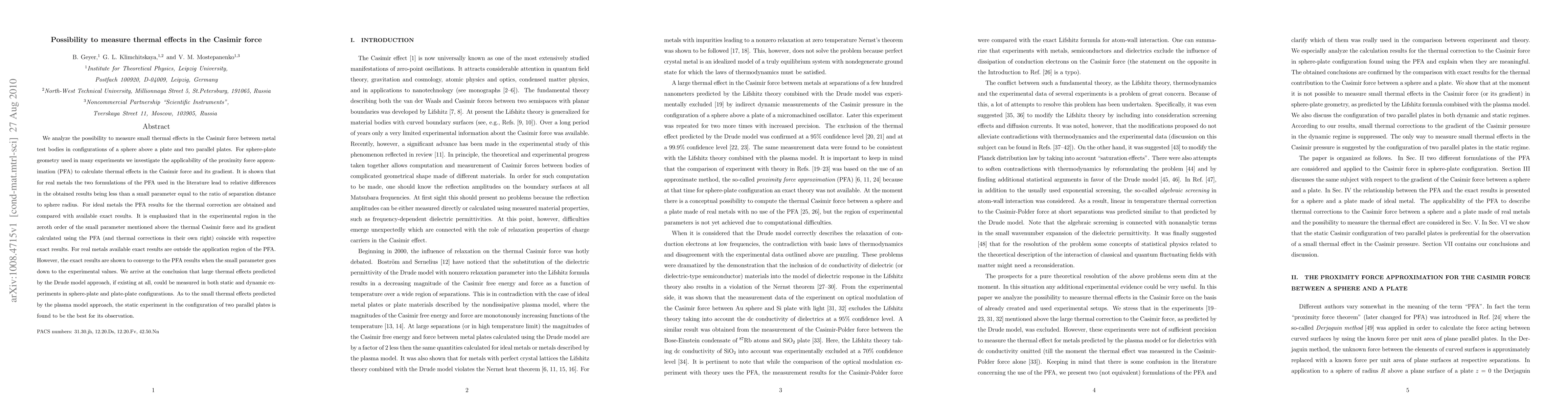 This paper investigates the feasibility of measuring thermal effects in the Casimir force using sphere-plate and parallel plate configurations. It concludes that while the proximity force approximation (PFA) is applicable for real metals, large thermal effects predicted by the Drude model may be detectable in both static and dynamic experiments. Small thermal effects from the plasma model approach are best observed in static parallel plate experiments.