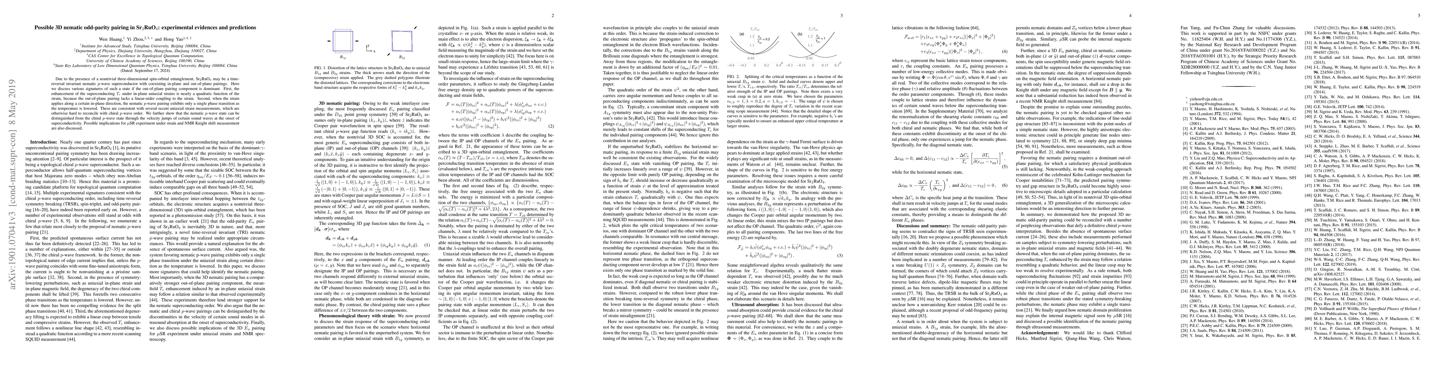 This paper explores the possibility of a 3D nematic odd-parity pairing in Sr$_2$RuO$_4$ and provides experimental evidence supporting this state, including quadratic enhancement of $T_c$ under in-plane uniaxial strains and single phase transition behavior. It also predicts distinguishing features such as velocity jumps in sound waves and implications for $\mu$SR and NMR measurements.